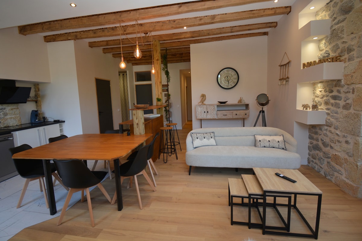 Áit iontach le fanacht chun do scíth a ligean i síocháin agus dícheangal! Is árasán dúbailte 100m2 é ár n - árasán, athchóirithe agus maisithe i stíl Lochlannach. An - gheal, tá sé suite in áit chiúin chónaithe, siúlóid 5 nóiméad ó lár Bourboule. Tá gach siopa, bialann, folcadán teirmeach, Casino, Parc Fenestre agus tointeálaithe chuig na fánaí sciála laistigh d'achar siúil. I gcarr, tá ionaid saoire sciála Nordacha agus Alpacha an Massif de Sancy 10 -15 nóiméad ar shiúl.