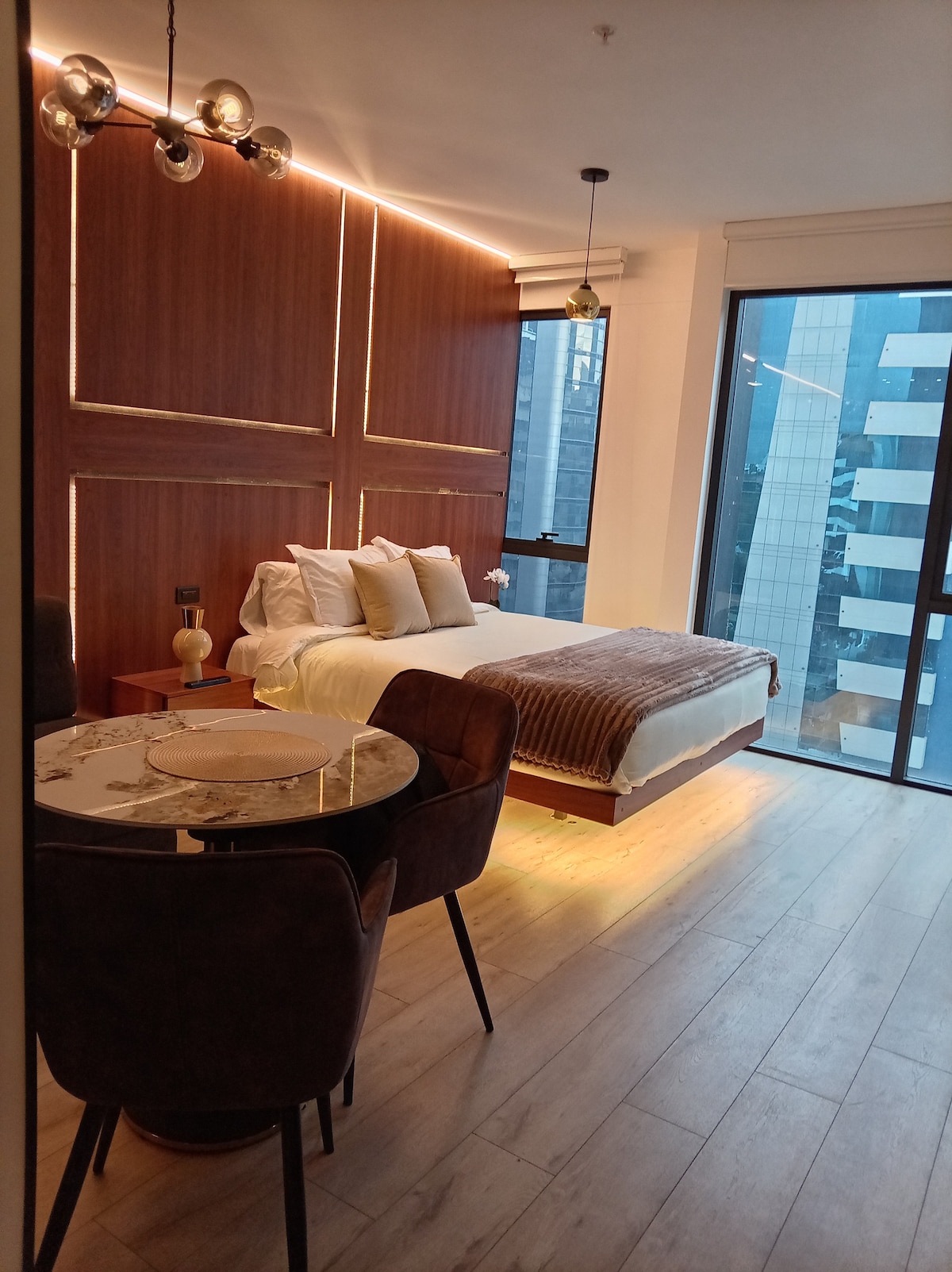 ApartStudio moderno de lujo con piscina temperada, con la mejor vista panorámica de Quito donde puedes disfrutar de una experiencia en un edificio nuevo a una cuadra del parque La Carolina, excelente para gustos exclusivos, cerca de los mejores centros comerciales, restaurantes, cafés, cines, centros financieros y estadio. Cuenta con dos Lobby de acceso desde la República del Salvador o desde la Luxemburgo. OBS: 13 y 14 de enero NO hay áreas húmedas.(por mantenimiento excepcional del año