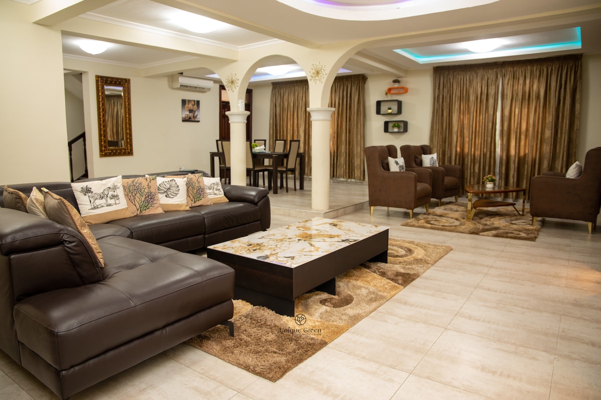 Enjoy an enriching experience in this luxurious home @East Airport, perfect for your family & groups. House is fully fitted w/ACs,functional kitchen, super comfy beds,cozy couch,security,unlimited internet,DSTV,entertainment systems,& a 66kva backup Generator for your endless comfort. Location is 10min drive from Airport & within 15min radius of all the prime entertainin & business locations in the city including Labadi Beach,East Legon,Accra Mall,popular restaurant&nightlife. Be Warmly Welcome