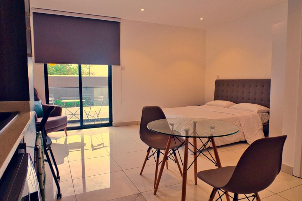 Fan i stiúideo sómasach ar an díon in Cantonments, céimeanna ó Kangei Sky Bar & Restaurant — suite go foirfe agus feistithe go hiomlán le haghaidh gnó nó fóillíochta. ✔ < 10 nóiméad go dtí an tAerfort, Ambasáid na Stát Aontaithe, Maxmart/Waitrose, bialanna, Jubilee House agus nithe is díol spéise ✔ Glanadh saor in aisce ach é a iarraidh le fógra 24 uair an chloig ✔ WiFi snáithín ardluais & Teilifís Chliste ✔ Linn Snámha, Giomnáisiam & Ióga ✔ Balcóin, Leaba Bhanríona & Nespresso ✔ Deasc Oibre, Slándáil 24/7 & Concierge Gineadóir ✔ Fuireachais → Bain sult as compord, stíl agus luach nach féidir a shárú nuair a fhanann tú linn