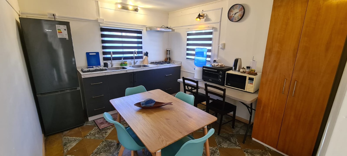 Cábán teolaí i suíomh nádúrtha, Campo - mar,taobh istigh d'árasán príobháideach a bhfuil radharc agus sliocht ar an trá,gar do thrá Luna idir Horcón agus Maitencillo. 2 Sheomra leapa 1 Seomra folctha - Seomra leapa 1: leaba dhúbailte (leaba 2 shuíochán) - Seomra leapa 2: Leaba amháin de 1 - bosca,seomra bia - Cistinéad iomlán le countertop,oigheann, cochall,cumascóir,cumascóir,citeal citeal tae leictreach, tóstaer leictreach, tóstaer traidisiúnta. - Briseadh le gríoscán gualaigh. - teilifíseán, teilifíseán díreach, futon agus seomra bia