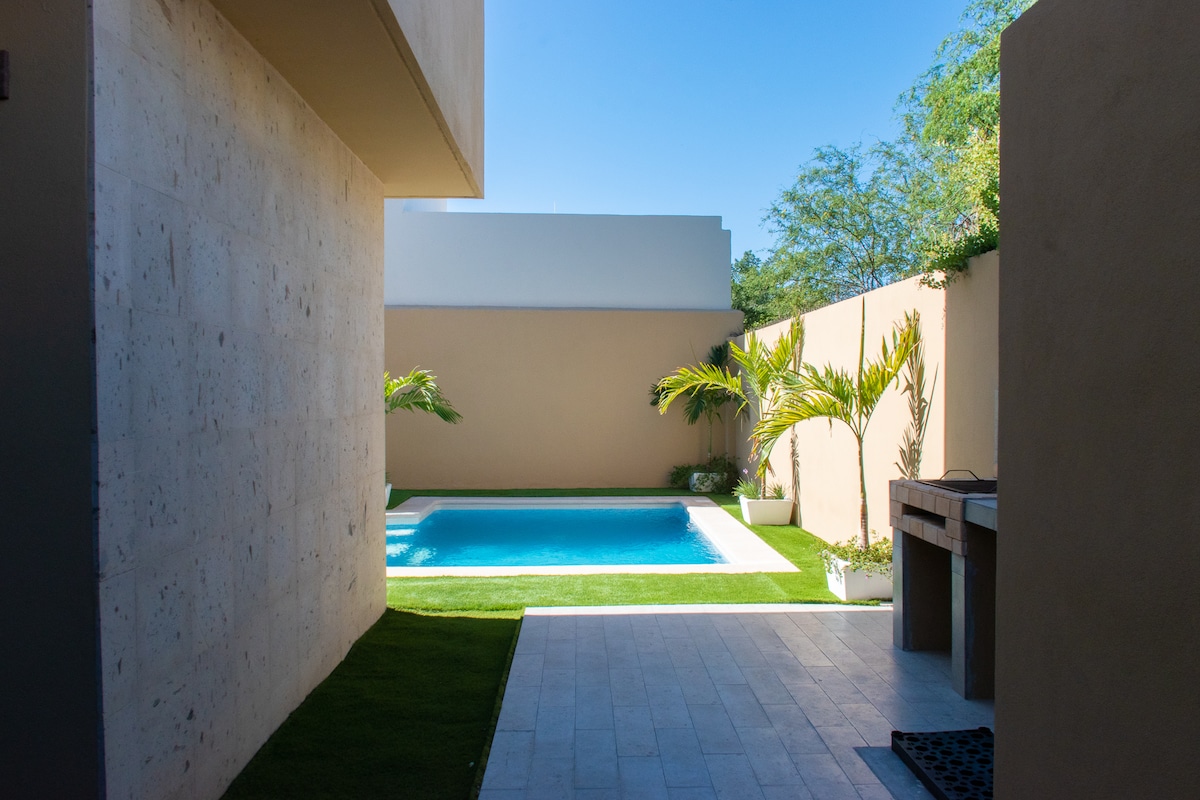Teach fairsing le linn snámha, in aice leis an trá agus leis an gclárchosán