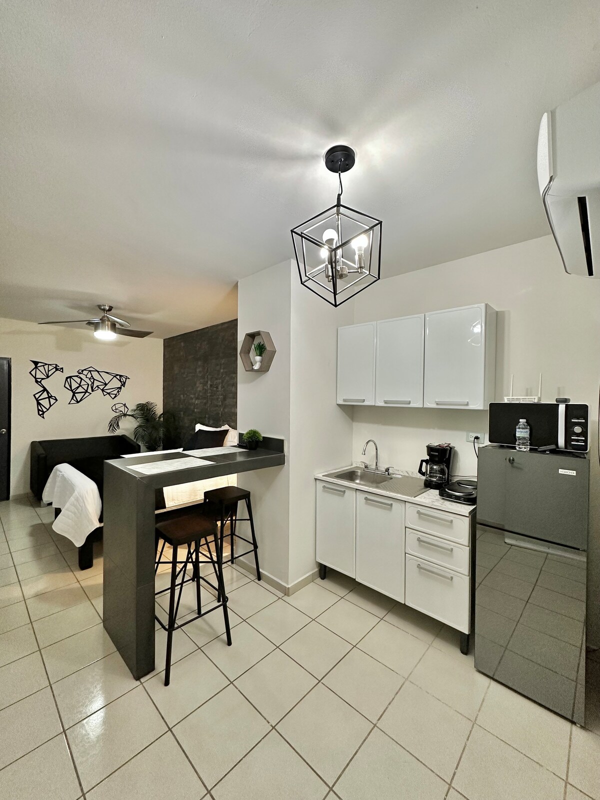 Árasán FEISTITHE, le suíomh lárnach den scoth, ar shiúl ó bhrú agus ó bhuille an cheantair siopadóireachta, suite 3 bhloc ó Ospidéal San Jose, 4 nóiméad ó Plaza Tutuli/Liverpool, 5 nóiméad ón Stáisiún Bus. Tá MATA 1 seomra leapa, 1 seomra folctha iomlán, seomra bia, cistinéad feistithe ann, tá gach saoráid ann, WI - FI, Teilifís Chliste (gan chábla), ceamaraí faireachais seachtracha, glas leictreach, féinseiceáil isteach agus páirceáil féin os a chomhair (lasmuigh).