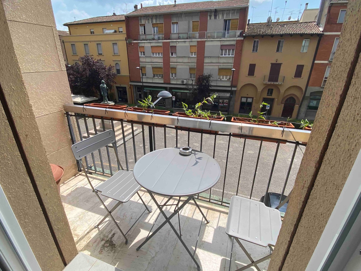 Stiúideo athchóirithe le déanaí, atá suite ar phríomhchearnóg Budrio, ag breathnú amach ar dhá bhalcóin. Tá sé 100m ón stad bus, 200 méadar ón stad traenach agus 350 ón ospidéal. Téamh urláir, cistin ina bhfuil oigheann traidisiúnta, micreathonnán, déantóir caife, cuisneoir agus reoiteoir. Nigh triomadóir agus líne éadaí. Leaba Fhrancach. Teilifís chliste agus WI - FI saor in aisce. Cithfholcadán mór le cróiteiripe. Tá sé ar an dara hurlár gan aon ardaitheoir.