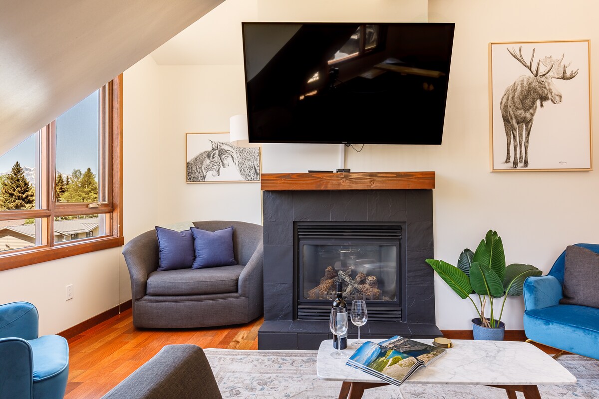 Fáilte go dtí do shaoire! Tá an maisiúchán comhaimseartha, blasta agus fáilteach. Tá fuinneoga móra sa seomra suí coincheapa oscailte a thugann solas nádúrtha & frámaí isteach na radhairc iontacha ar an sliabh. Tá leaba rímhéide sa seomra leapa le síleálacha boghtaí. Bain sult as urláir seomra folctha téite, dé - dhoirteal, cithfholcadán báistí & tobán. Soláthraíonn deic mhór ar an díon príobháideach radhairc lánléargais ar na Rockies! Suite ar shiúlóid ghearr ó lár bhaile Banff agus cuireann sé bealach isteach príobháideach d'aíonna ar fáil.