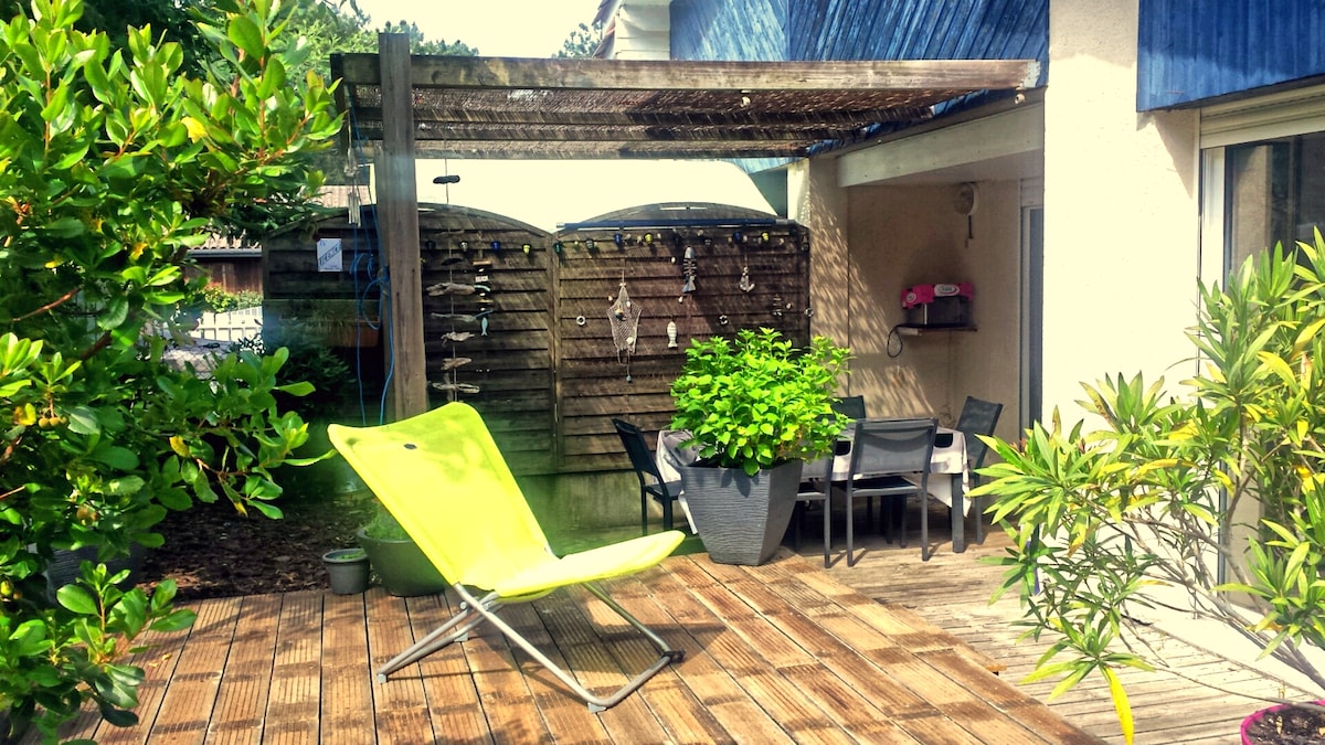 Teach 42 m2 i réadmhaoin phríobháideach, limistéar glas agus ardán. Suite 3 km ón loch agus 10 km ón aigéan. Tá an áit oiriúnach do shaoire chiúin in aice leis an dúlra. Cosán rothar 800 m chuig an aigéan nó chuig an loch . Downtown 1.5/2 km ar shiúl An t - ardán lasmuigh lena pergola , beárbaiciú, cathaoireacha gréine, scáth fearthainne , cathaoireacha uilleacha chun tréimhsí taitneamhacha agus scíth a chaitheamh. Chomh maith leis sin oiriúnach do 2 chomhghleacaithe, mar gheall ar clic clac. Páirceáil phríobháideach isteach ón réadmhaoin.