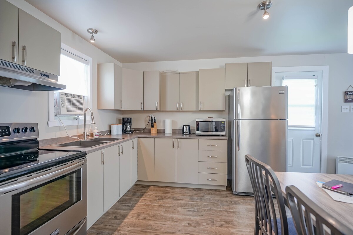 Teachín álainn i gceantar síochánta díreach cois uisce. Sráid phríobháideach i bhfad ó na príomhbhóithre. SPÁ, Teallach, limistéar mór oscailte leis na seirbhísí go léir ar an láthair lena n - áirítear aerchóiriú. Teallach lasmuigh, bád céaslóireachta. Cistin, seomra folctha agus seomra níocháin. Cuntar lóin agus atmaisféar seanré le síleáil na hardeaglaise sa seomra suí. Cistin iomlán le gach fearas. Tá Utensils agus gréithe críochnaithe do 8 duine. Saor in Aisce WIfi Access agus Keurig meaisín : Uimhir CITQ : 299848
