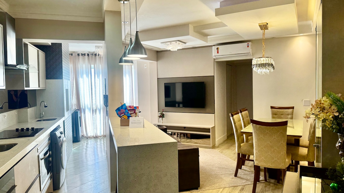 Bain sult as compord agus fóillíocht ar thránna áille SC an deiscirt! Lochta le leaba bhanríona, leaba shingil agus bord bia. A/C, Wi - Fi, Teilifís, Cistin iomlán. Féach ar thrá Cardoso, Cigana, Praia Grande, Galheta, Morro do Céu, Laguna. Lonnaithe in Óstán Apart Farol de Santa Marta, tá roinnt áiteanna coiteanna ann amhail linnte lasmuigh, linn snámha theirmeach, giomnáisiam, sabhna, seomra cluiche, béile, limistéar beárbaiciú, srl.