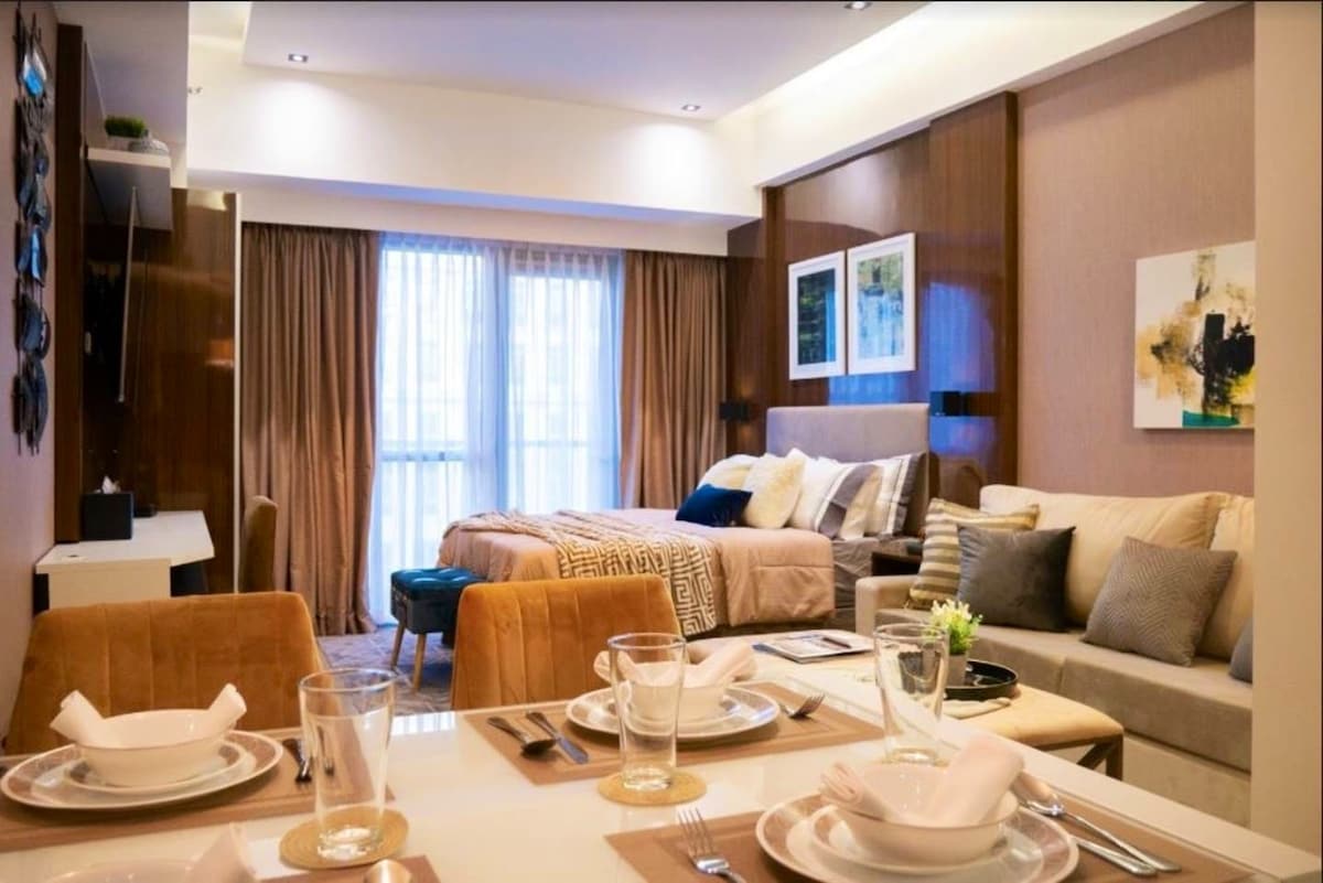 Le taobh istigh úr spreagtha trópaiceach, cuireann an t - aonad 1BR seo in One Uptown Residences ag Bonifacio Global City fanacht speisialta suaimhneach ar fáil d'aíonna. * WI - FI 400MBPS SAOR IN AISCE, Teilifís Chliste, Cábla, Netflix, Disney+ *Meaisín níocháin & triomadóir *Linn Snámha * Cistin lánfheistithe le sorn, cuisneoir, micreathonnán, déantóir caife, tóstaer, earraí cócaireachta & bia. Lonnaithe díreach trasna Uptown Mall, The Palace, Mitsukoshi Mall, agus Grand Hyatt Hotel. Siúlóid 7 -10 nóiméad go dtí Ionad Leighis Naomh Lúcás agus an tSráid Ard in BGC.