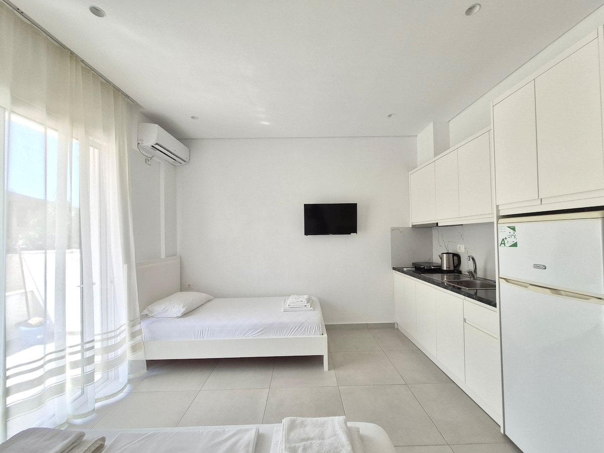 Tá ár stiúideo suite in aice le príomhshráid Ksamil 2 nóiméad de shiúl na gcos ón trá agus go leor siopaí do gach riachtanas. Spás a thairiscint le haghaidh dinning, suí, teilifís chliste, Leaba dhúbailte agus oiriúnach i vardrús, cistin atá forbartha go hiomlán, cuisneoir srl. Seomra folctha le cithfholcadán cábáin.