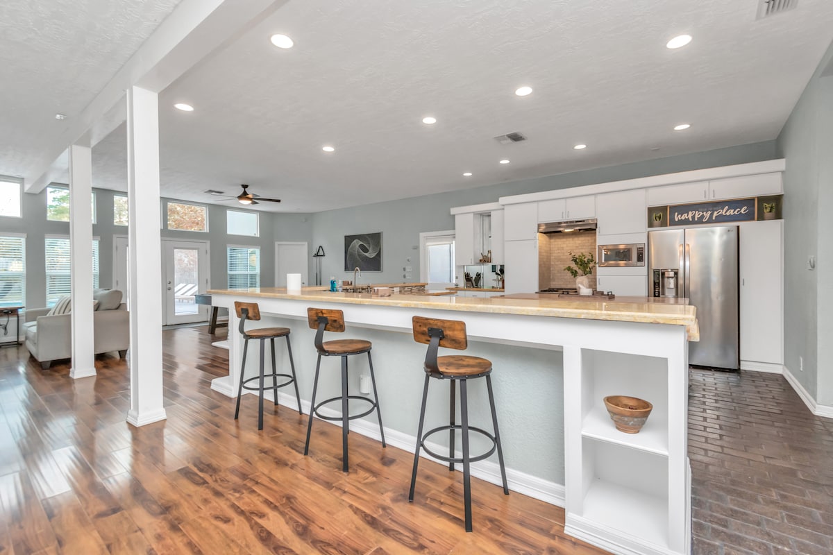 Teach taibhseach comhaimseartha le Linn Snámha Príobháideach ar phobal gailf! Soláthraíonn an teach seo plean urláir oscailte, atá foirfe don teaghlach le chéile. Is féidir leis an teach seo suas le 14 aoi a óstáil go compordach! Teach aon stóir gan aon staighre le bheith buartha faoi agus neart páirceála! Tá go leor saoráidí sa teach chun gach duine a choinneáil gnóthach. Bain sult as deoch ag an linn snámha nó smores ag an bhfearas dóiteáin, déan cuimhní cinn linn!!