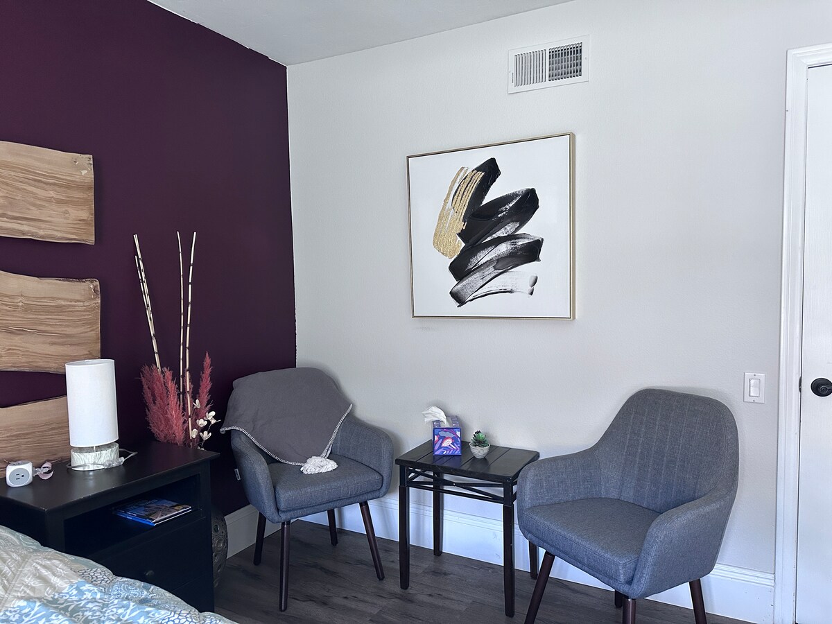 Níl sé ach 3 nóiméad ón saorbhealach 5 suíonn an stiúideo príobháideach seo. Nuair a bheidh tú trí do bhealach isteach príobháideach beidh tú ar do shuaimhneas. Leaba bhanríona chompordach, teallach agus cistinéad lánstocáilte le mionchuisneoir/ reoiteoir má bhraitheann tú go bhfuil tú ag cócaireacht. Tá tábla/ deasc 2 dhuine os comhair an teallaigh theolaí freisin. Coinníonn an lucht síleála rudaí fionnuar. Seomra folctha iomlán le cithfholcadán agus tobán folctha. Tá trá Salt Creek,Dana Point Harbor agus Trestles ach 15 -20 nóiméad ar shiúl. Suíomh Mór!