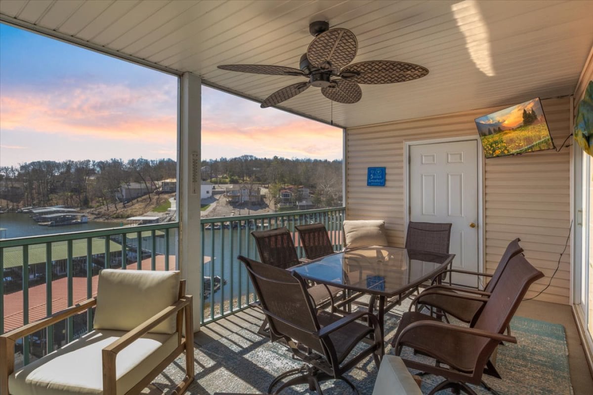 Sip your morning coffee on our screened in patio watching the sunrise on the lake in this stunning 3-bed, 2-bath on Lake of the Ozarks' only habitable island! Relax, unwind and enjoy everything the lake has to offer. Spend the day boating or jet skiing right from your doorstep. • No stairs • stocked kitchen • Across from Scooters Boat Rental – boats delivered right to you • Nearby dining spots by boat like Tap & Grill, Coconut’s, Lake Burger & Boathouse • Pool access (summer)