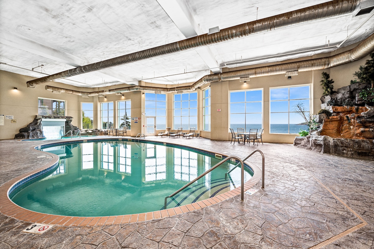 Our condo is the perfect hub for your next adventure! Spend the day taking advantage of the local activities/sights; or kickback, unwind, and enjoy the breathtaking views & cozy atmosphere of Chateau Leveaux. In addition to the pine walls & private fireplace that give you the feel of your very own north woods cabin, our unit also provides you with the comforts of home away from home. Hang out in the pool/hot tub/sauna/gameroom/lodge and enjoy the rooms walk out access to stunning Lake Superior!