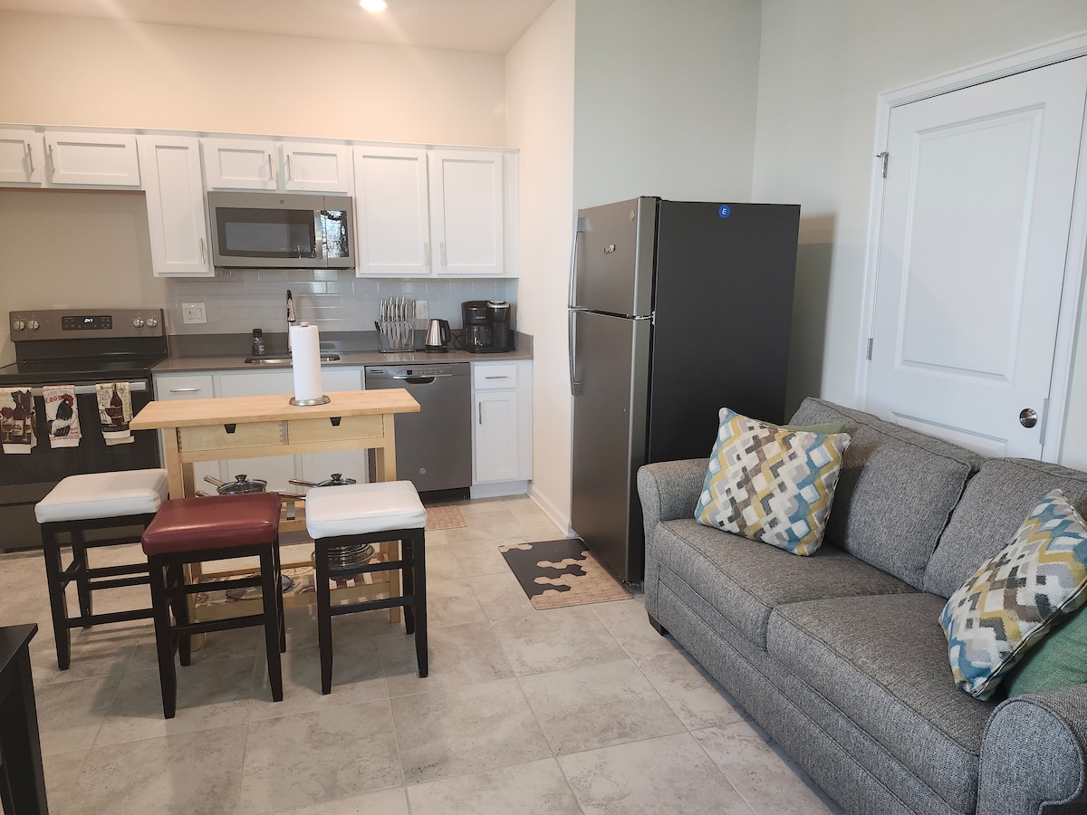 Lig do scíth sa spás socair galánta seo. 2 dhuine ar a mhéad. Tá bealach isteach ar leithligh ann tríd an ngaráiste. Is teach teaghlaigh aonair é an réadmhaoin ina bhfuil 2 aonad. Tá an spás príobháideach, ní roinneann sé spás. Tá Wi - Fi, A/C agus páirceáil san áireamh. 1BR Leaba na Banríona, 1 Seomra Folctha le tobán, tá meaisín níocháin/triomadóir suiteáilte agus seomra cluthar Maireachtála le teilifíseán 55 orlach. Turas 25 nóiméad chuig DIsney World agus 35 nóiméad go dtí Universal Orlando. A Walmart Supercenter 8min ar shiúl. Stáisiún gáis 3 nóiméad ar shiúl.