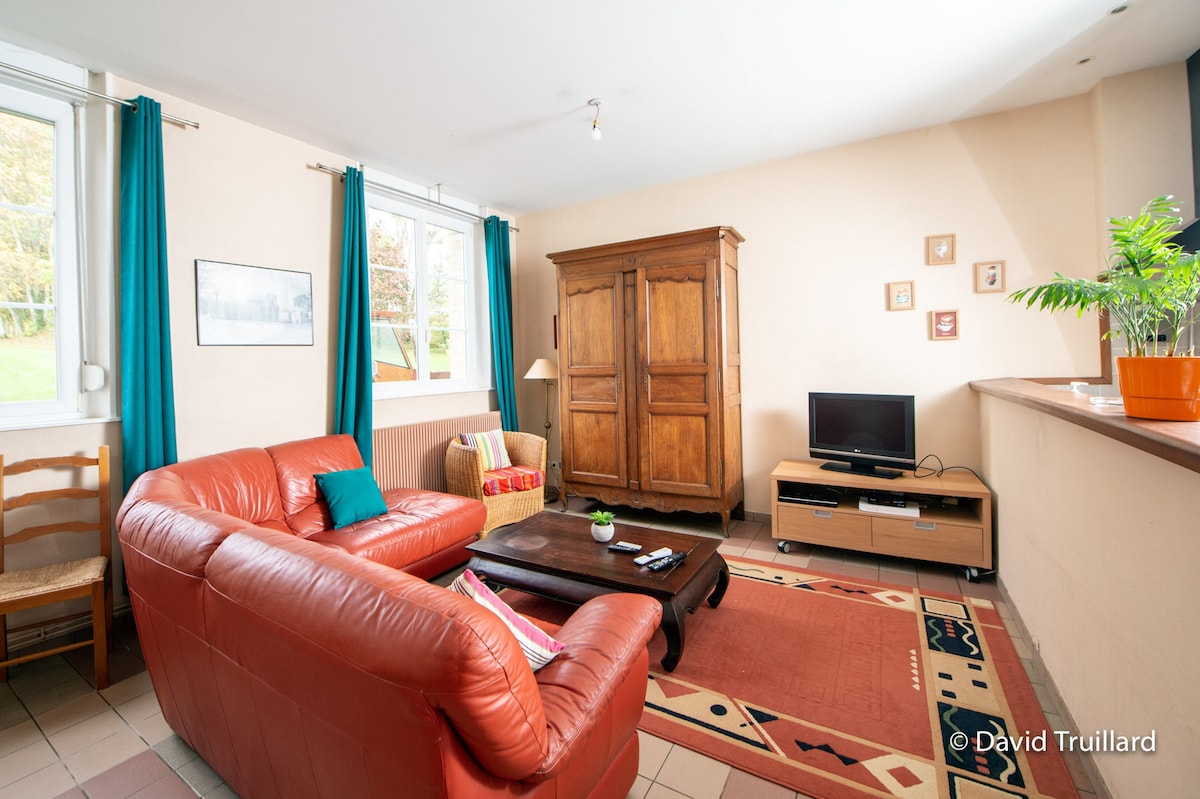 Idir Charleville (45 km, áit Ducale, féile des Marionnettes, Cabaret vert ) agus Reims (70 km, ardeaglais, siléir Champagne), 2h30 ó Pháras agus 70 km ón mBeilg, teach beag gleoite atá athchóirithe go hiomlán (rangaithe 3 réalta) le gairdín mór 900 m2 i sráidbhaile beag ciúin (220 cónaitheoir) cúpla céim ó panorama deas ar ghleann Aisne agus ag tús an chosáin ghlas ó dheas - Ardennes (110 km de chosán rothair ar feadh na canála). Facebook: fb.me/lapetitemaisonbleuevqonc