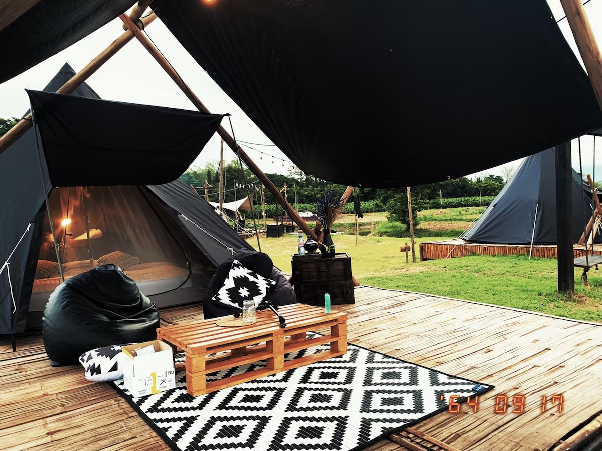 ( OAB. ) PLACE OF REST AT CHIANG DAO All black Tent + Private zone ( Shared bathroom ) โอบสวัสดีค่ะ Winter Season All black Tent + Private zone ( Shared bathroom ) สำหรับการเข้าพัก 2 ท่าน รวมอาหารเช้า - เย็น minibar และ welcome drink Extra 800 บาท/ท่าน เสริมได้ 2 ท่าน - แอร์ - ไดร์เป่าผม - กาน้ำร้อน