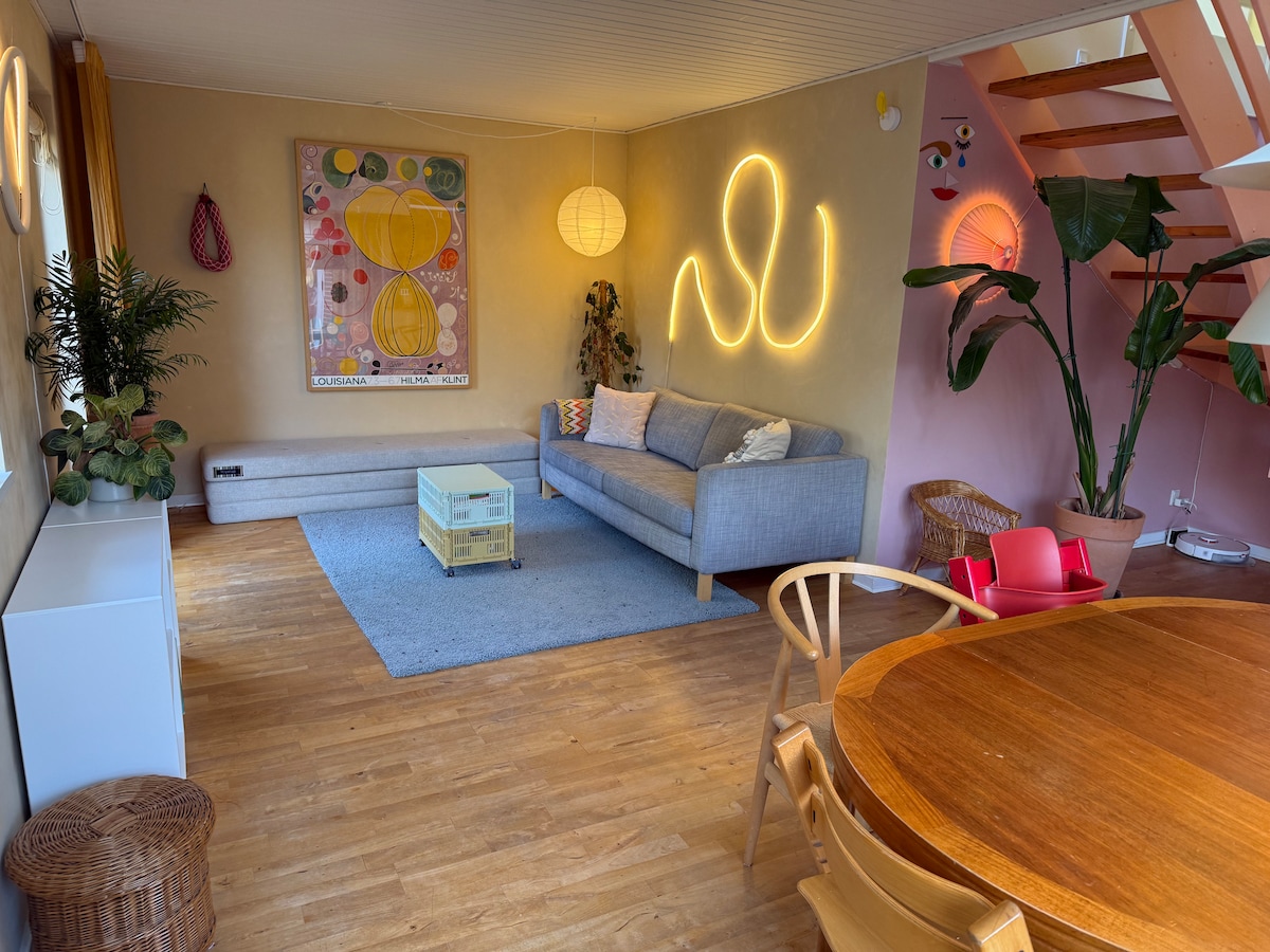 Bain sult as fanacht socair, suite go lárnach inár n - árasán 75 m² a athmhúnlaíodh go hiomlán le déanaí. Foirfe do thaistealaithe aonair nó do lánúineacha atá ag iniúchadh Odense. Buaicphointí: - Seomra leapa mór ina bhfuil leaba rímhéide - Cistin lánfheistithe - 75” Samsung Frame TV - Stóráil ampl - Trealamh paitió lasmuigh - Cluthar na Danmhairge hygge ar fud - Tocht aeir roghnach na banríona - Iontráil gan eochair Is é seo ár dteach pearsanta sa Danmhairg, athchóirithe go tuisceanach, agus táimid ar bís é a roinnt leat.