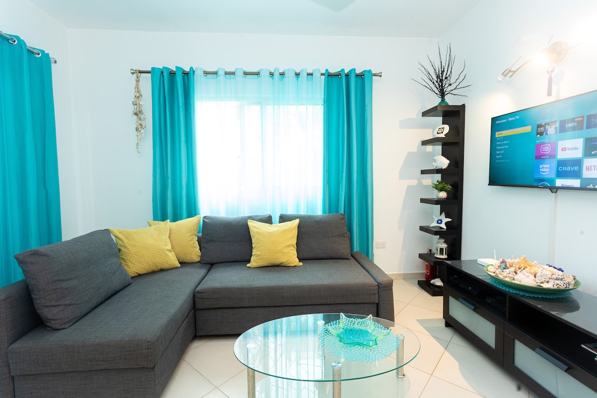 Fáilte chuig d'árasán PARTHAIS COIS TRÁ in Las Terrenas, díreach ar shiúl ó thrá Punta Popy. Soláthraíonn coimpléasc La Fenice slándáil 24/7 agus rochtain ar dhá linn snámha uisce farraige, le bialanna agus beáir in aice láimhe. Tá seomra leapa fairsing ar an árasán ina bhfuil leaba bhanríona agus leaba thoilg sa seomra suí, atá in ann freastal ar suas le 4 dhuine. Bain sult as cistin, meaisín níocháin (agus raca éadaí le triomú), teilifíseán cliste, teilifís chábla, Wi - Fi, A/C, lucht leanúna síleála, agus ardán príobháideach.