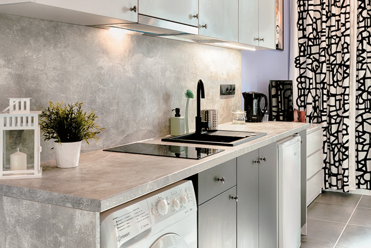 Árasán stiúideo galánta atá oiriúnach go foirfe le haghaidh lóistín i gcroílár Łódź. 1 km ó Shráid Piotrkowska - an siúlán cáiliúil Łódź. A bhuíochas leis na taisceadáin eochrach, is féidir seiceáil isteach agus seiceáil amach a dhéanamh go héasca, go neamhspleách agus go tapa. Tá tolg infhillte agus leaba ardaithe ar fáil do na haíonna. Tá an t-árasán suite i gcúl an tithe cathrach athbheoite in Łódź. Tá cistin lánfheistithe ann agus na glantacháin agus na háiseanna riachtanacha go léir.