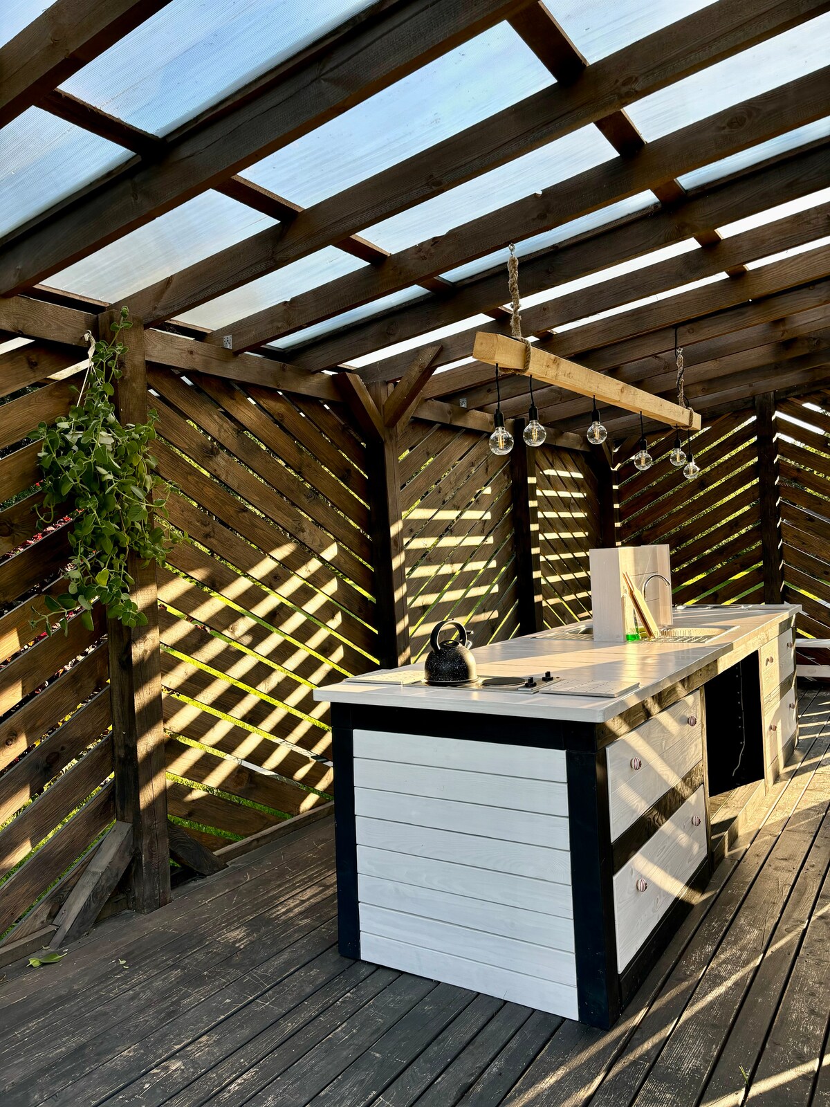 Teach cluthar geal adhmaid i gcríoch an tí aíochta “Šůilas ”. Ceantar glas, ciúin agus síochánta. Tá sé suite 4,5km ó chathair Liepāja agus 300m ónár bhfarraige álainn Bhailt. Tá trá ghainimh bhán chiúin agus chomhchuí againn. Ag mothú gur leatsa an trá ar fad. Tá Wc agus cithfholcadán suite ~ 50m ó bhungaló agus roinntear é le haíonna eile i gceantar campála. Tá cistin choiteann ina bhfuil sorn agus gabhálais eile ar fáil ag an láthair champála.
