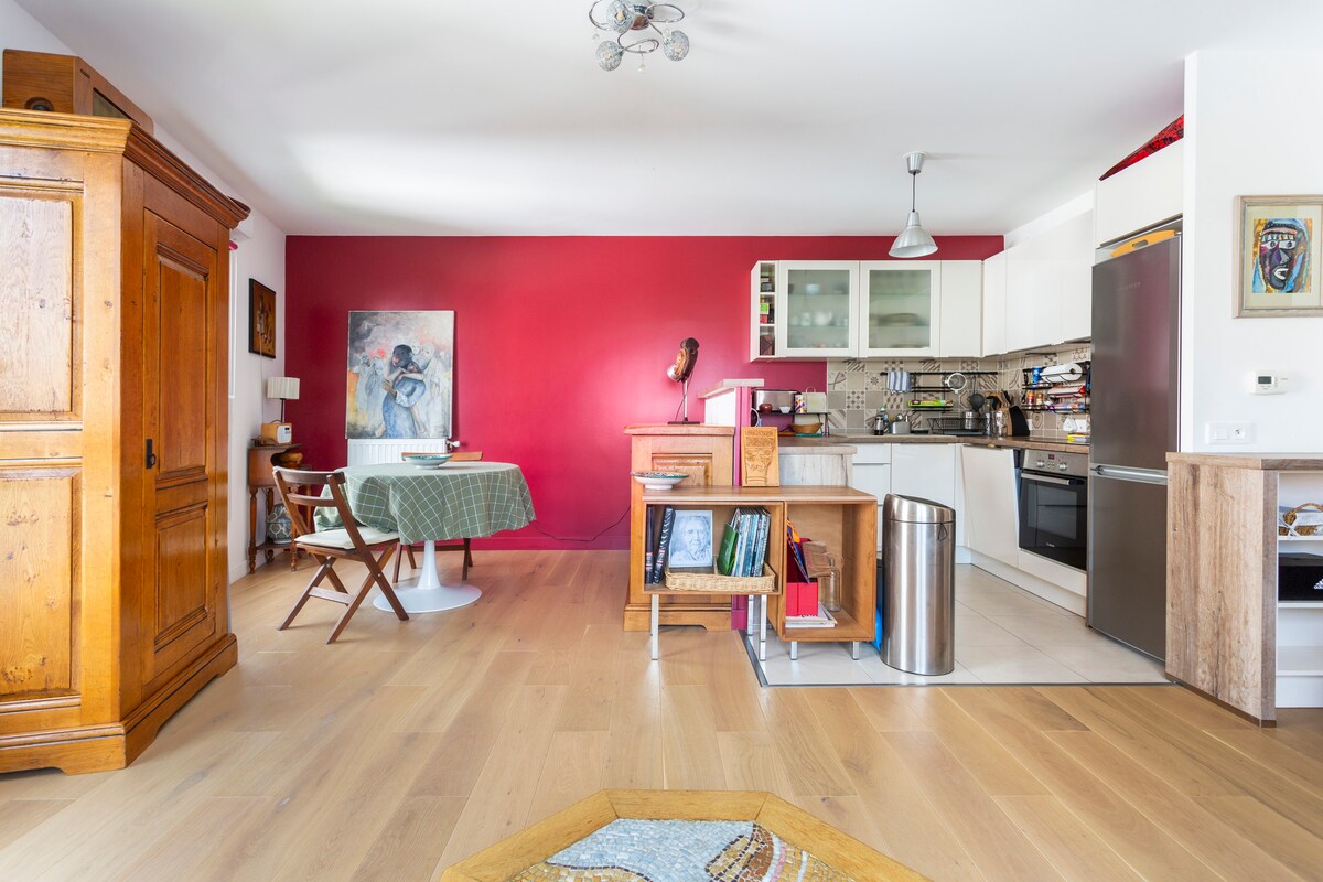 Árasán iontach sómasach comhaimseartha 90m2 i bhfoirgneamh slán, is féidir páirceáil. Ardán le crainn ar ghairdín ciúin. 2 sheomra leapa, 2 sheomra folctha, 2 leithreas, seomra suí mór, pianó, cistin álainn le gach compord. Comharsanacht an - bhríomhar, gach siopa, bialann agus iompar éasca. An fíor - Pháras agus ciúin ar an ngairdín. Fiosraigh enchantment. Glanadh cosanta Covid 19 curtha ar fáil ag speisialtóirí sláinte. Díghalrú tar éis gach fanachta.