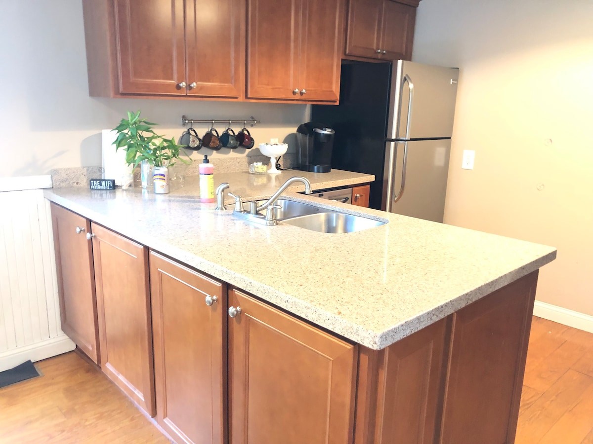 Fáilte chuig an Ballinger Suite, aonad fairsing dhá sheomra i bPrág Nua, MN. Bainfidh tú taitneamh as seomra leapa príobháideach ina bhfuil leaba bhanríona, teilifís agus áit suí chomh maith le seomra suí ar leith ina bhfuil, tolg, teilifís, tábla ardteicneolaíochta, cistinéad agus leaba murphy a chruthaíonn an 2ú rogha phríobháideach chun freastal ar 4 quests. Tá folcadán agus cithfholcadán tíleanna 3/4 inrochtana go háisiúil don dá sheomra. Tugann an réadmhaoin radhairc iontacha ar shéipéal Naomh Wenceslaus agus tá sí áisiúil don phríomhshráid, do bhialanna agus do ghalf.