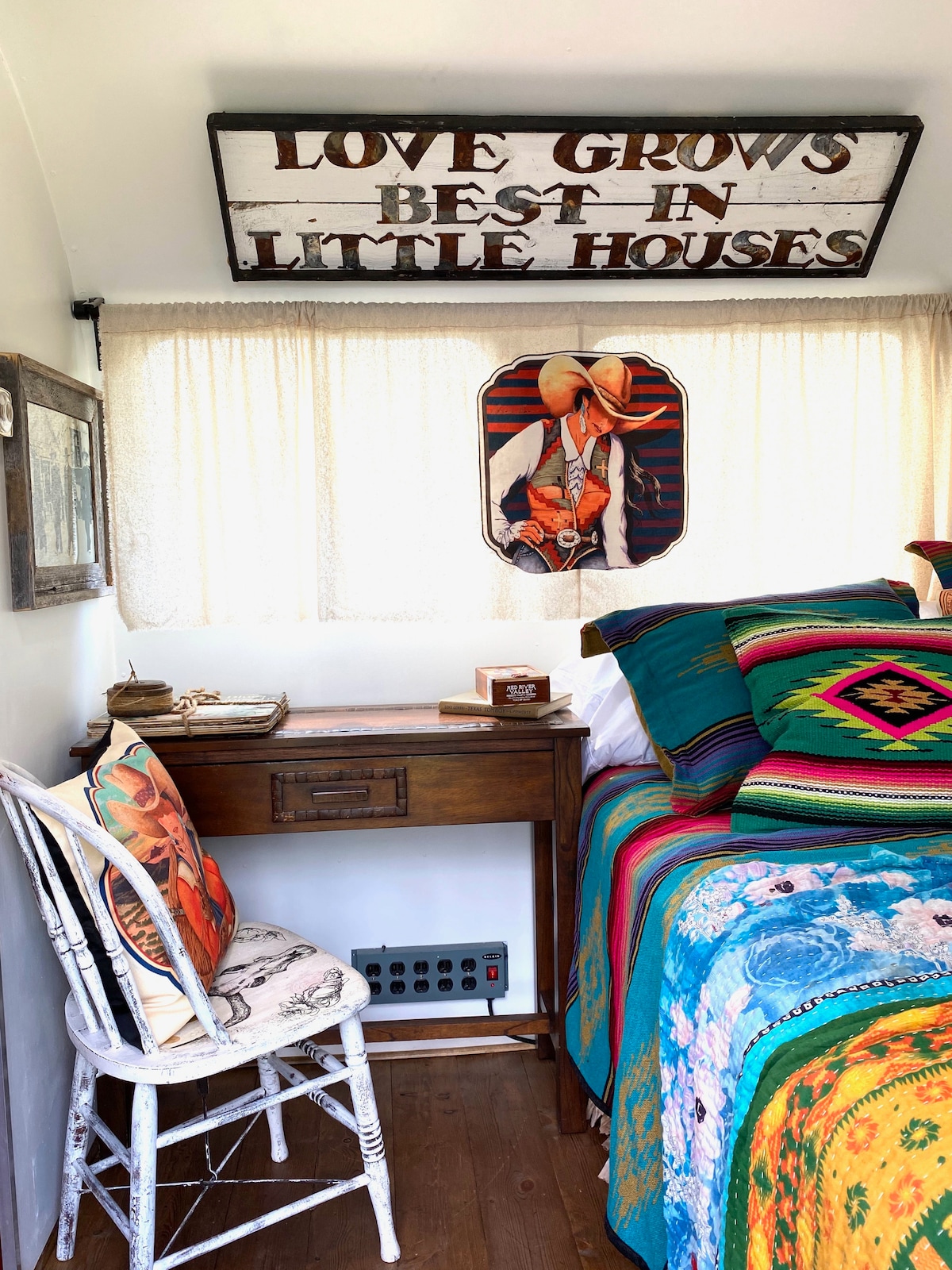 Faigh blaiseadh de cheantar gleoite, insiúlta Old Town Leander in a Vintage Airstream a nuashonraíodh go blasta agus do chompord ar intinn agat! Tá "The Cowgirl" gleoite & sassy, doirse salún seanré maisithe, grianghraif Old - West, doras sciobóil sleamhnáin, urláir ghiúise, agus buachaillí bó reibiliúnach ar na cuirtíní - gach mionsonra pleanáilte go cúramach. Tá doirteal, sorn gáis, sm. micreathonnán, cuisneoir, & pota caife Keurig sa chistin stocáilte. Cithfholcadán lánmhéide, uisce te, leithreas & doirteal sa seomra folctha. Limistéar deisce le haghaidh oibre. Stól beáir amháin sa chistin.