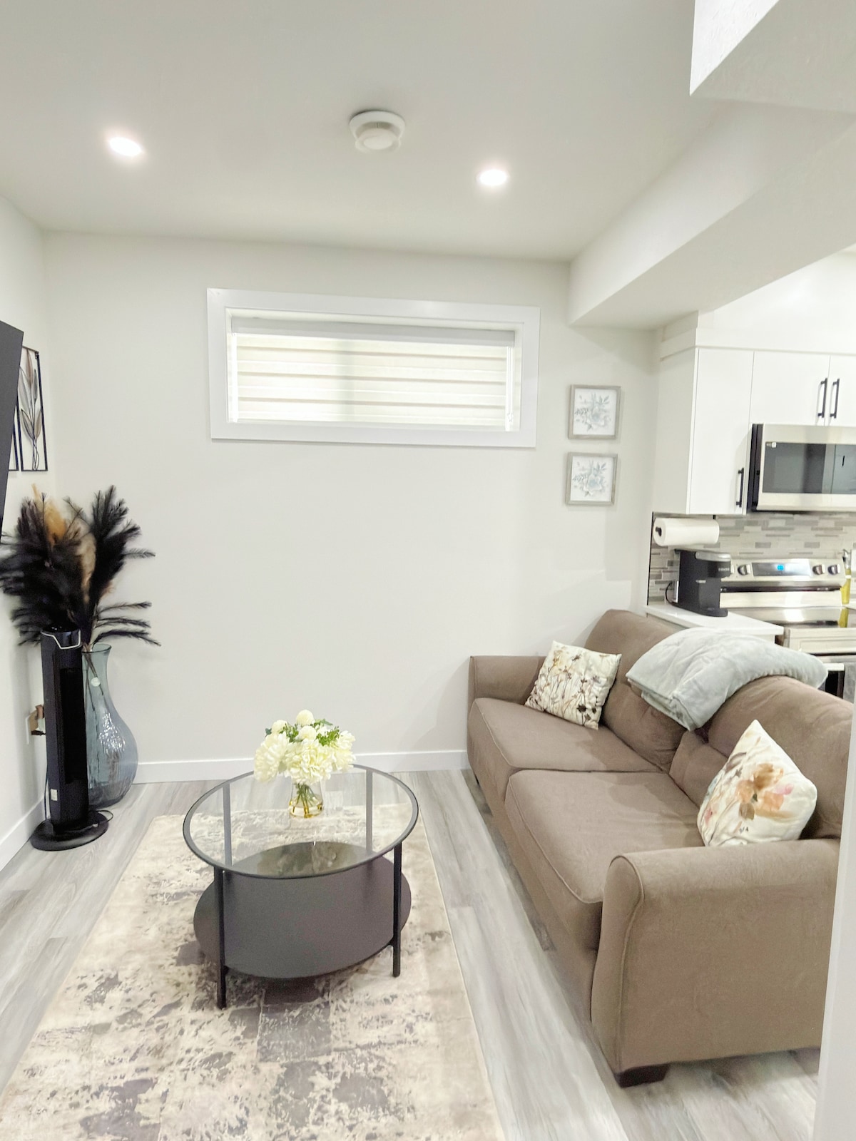 Svuít mhór phríobháideach íoslaigh. Seomra suí galánta maisithe agus spás oifige tiomnaithe; Tolg deas le suí agus féachaint ar na seónna is fearr leat. Is féidir an tolg a athrú ina leaba Banríona chun freastal ar níos mó aíonna. Tá tocht compordach banríona le piliúir bhreise sa seomra leapa. Tá Bassinet ar fáil ach é a iarraidh. Tá an seomra suite laistigh d'achar siúil chuig clós súgartha, bialanna, siopaí grósaera, clinic siúil isteach, cógaslann, stad bus & 15 nóiméad DR go YEG. Glanadh déanta roimh theacht an aoi.