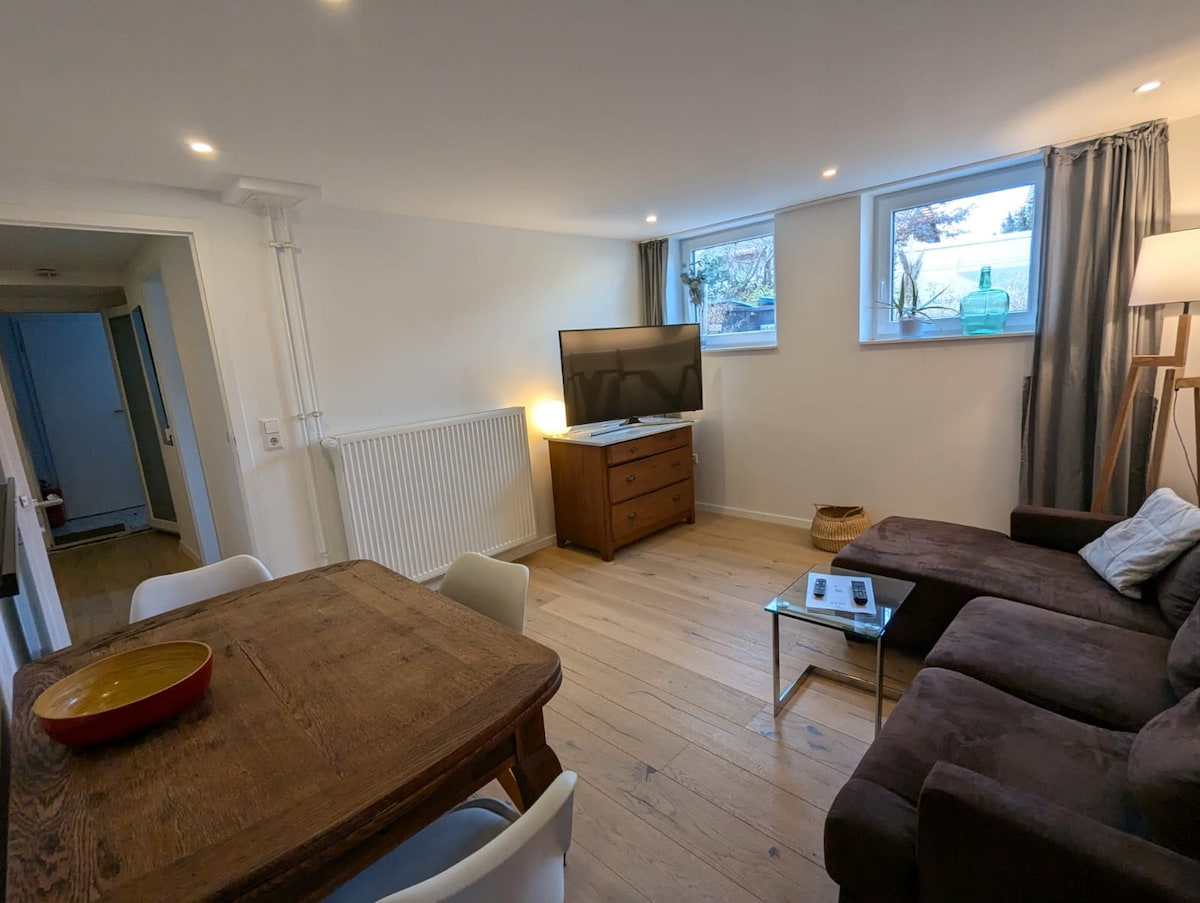 Tá árasán fairsing ar an mbunurlár ag fanacht leat. Suíomh an - chiúin in aice le S - Bahn (siúlóid 10 nóiméad). Ón áit seo is féidir leat lár chathair Stuttgart, na tailte taispeántais agus an t - aerfort a bhaint amach. Is éard atá san árasán seomra suí agus seomra leapa geal le leaba dhúbailte, tolg agus teilifíseán. Tá cistin bheag ann sa limistéar isteach agus seomra folctha príobháideach. Ón seomra suí tagann tú chuig d'ardán beag féin sa ghairdín. Tá a bhealach isteach agus a pháirceáil féin san árasán.