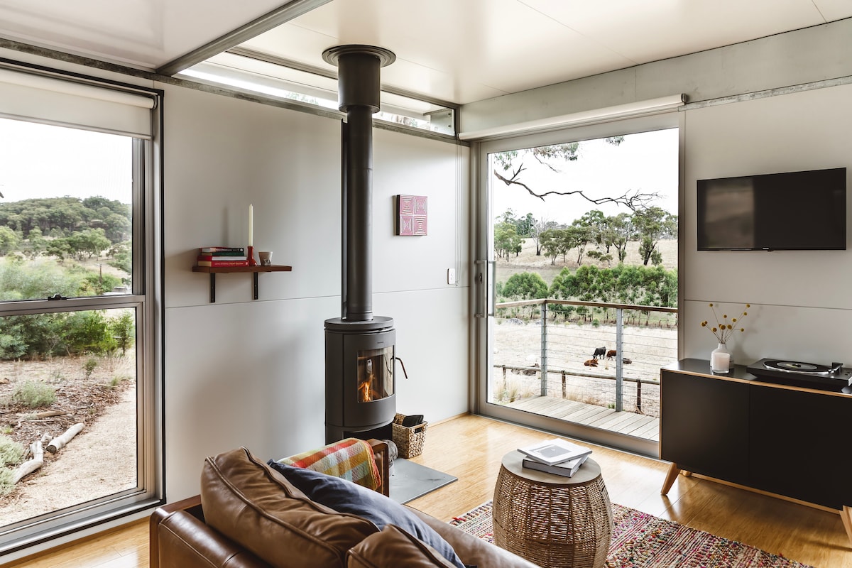 Suite i measc na ngumaí le radhairc fhairsinge ar fud na gcnoc, tá ár gcábán boutique 30sqm deartha mar shaoire shómasach féinchuimsitheach do bheirt, le gach rud a theastaíonn uait chun iniúchadh a dhéanamh ar ár réigiún iontach Adelaide Hills lena n - áirítear bosca bricfeasta gourmet atá lán de tháirgí áitiúla. Cibé acu saoire ghearr rómánsúil nó díreach mar gheall ar, tá spás curtha le chéile go cúramach againn inar féidir leat do scíth a ligean, do scíth a ligean agus athcheangal a dhéanamh.
