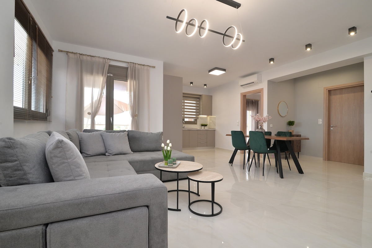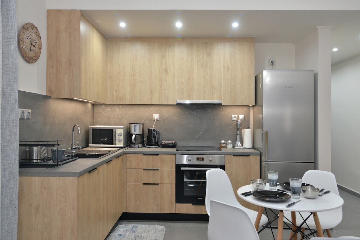 Árasán nua - aimseartha grianmhar 47sq.m. i lár Leptokarya, 10' ón bhfarraige & 5' ón stáisiún. Foirfe do theaghlaigh nó do ghairmithe, le bealach isteach neamhspleách, ardán, teilifíseáin chliste, cistin agus seomra folctha lánfheistithe le meaisín níocháin. Bunáit iontach do Olympus, láithreáin seandálaíochta & sráidbhailte traidisiúnta.