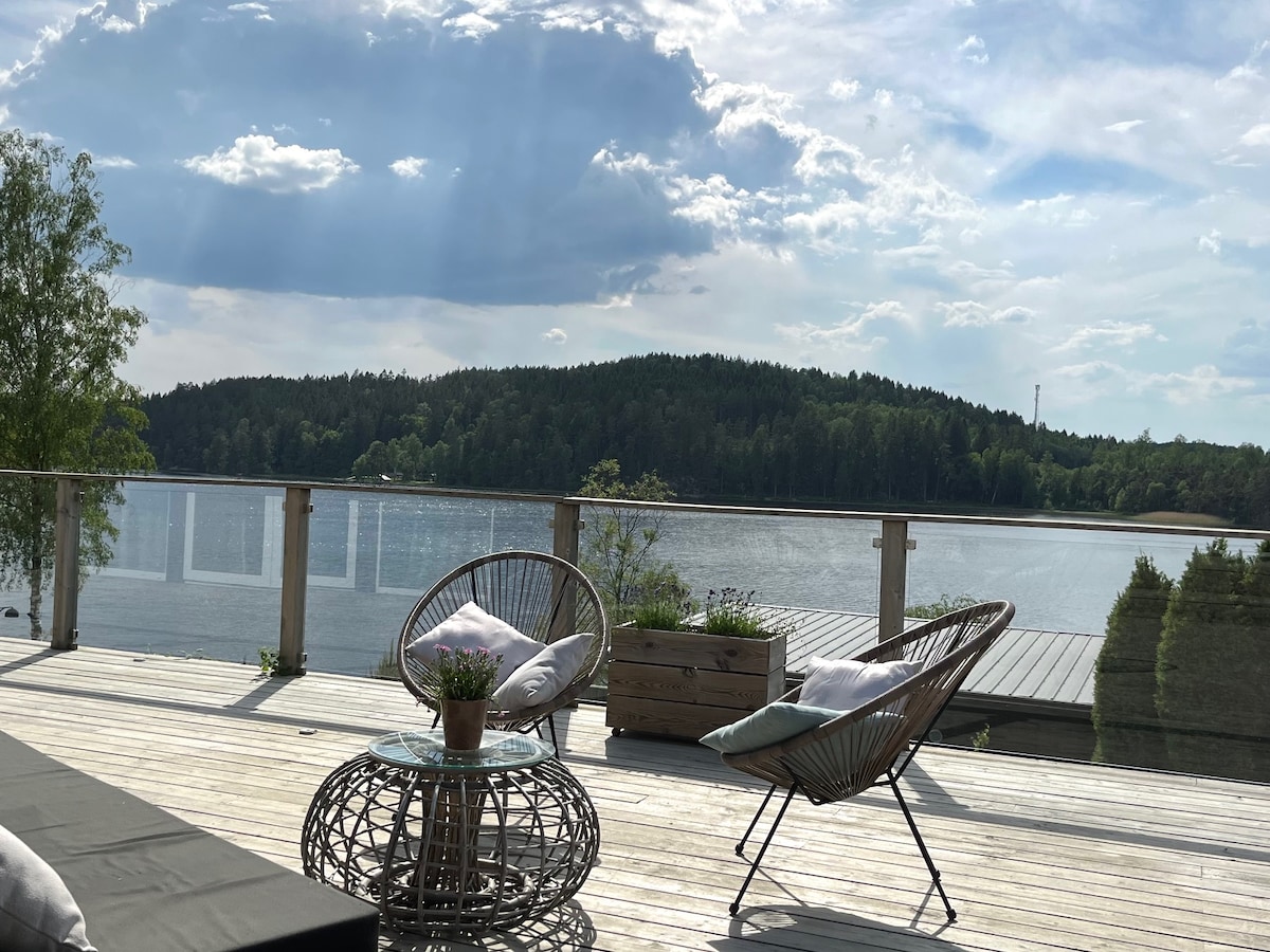 I lár an dúlra ach díreach 20min ó Gothenburg gheobhaidh tú an idyll. Anseo tá tú i do chónaí go compordach i dteach aíochta nua - thógtha ina bhfuil teallach, sabhna adhmaid agus tobán te. Timpeall an tí ar fad téann an deic mhór. Seo thíos cosán teolaí (50 m) chuig an lamairne phríobháideach le haghaidh stad maidine. Téigh ar thuras leis an mbád rámhaíochta agus bain triail as an ádh iascaireachta nó faigh ar iasacht ár mbeirt SUP. Sa gharchomharsanacht tá an fhásach le neart cosáin, lena n - áirítear: Cosán an fhásaigh, le haghaidh fánaíochta, reathaíochta agus rothaíochta sléibhe. Aerfort: 8 min Chalmers cúrsa gailf: 5 min