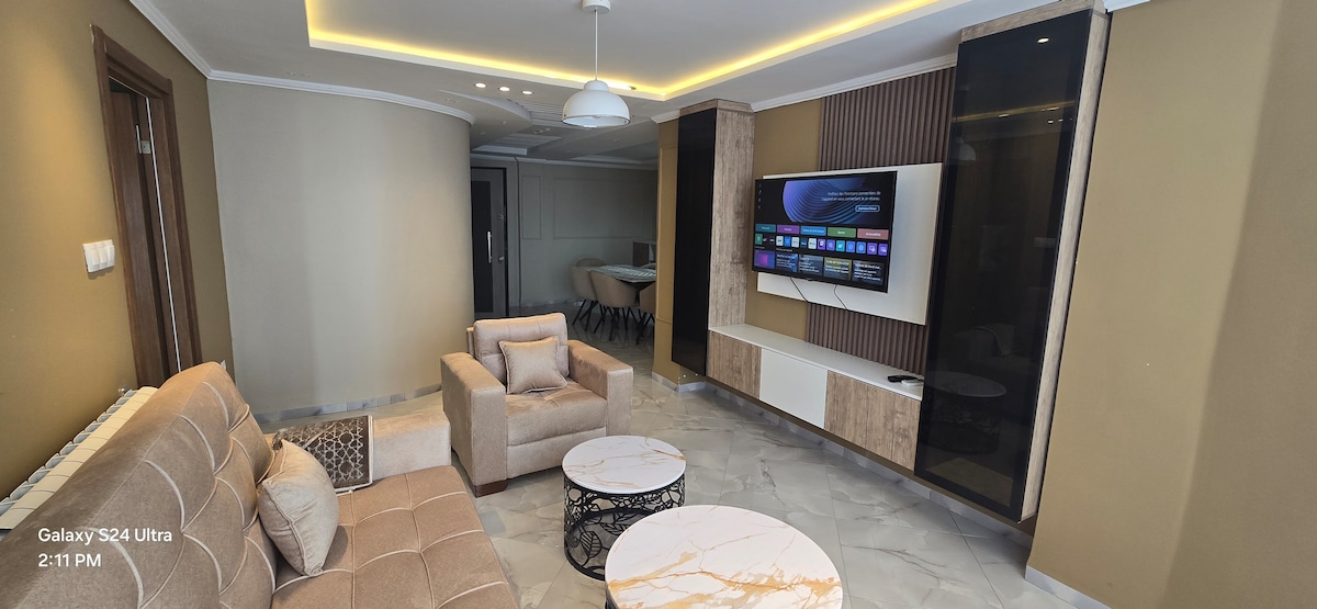 Árasán nua-aimseartha a tógadh le déanaí, suite ar an 5ú hurlár (gan ardaitheoir). Tá gach rud ann a theastaíonn uait le haghaidh fanacht compordach, lena n-áirítear Wi-Fi ardluais, leapacha teolaí, agus na saoráidí riachtanacha go léir. Suite go hidéalach i gcroílár Béjaïa, níl an t-árasán ach 5 nóiméad ar shiúl ón Golden Hotel, ó Ritaj Mall (1.3 km), agus ón siopa cáiliúil cístí Benchikh. Thart ar 2 km ar shiúl, ar Rue de la Liberté, gheobhaidh tú ceanncheathrú Wilaya freisin agus bialanna agus siopaí uachtair reoite éagsúla thart air.