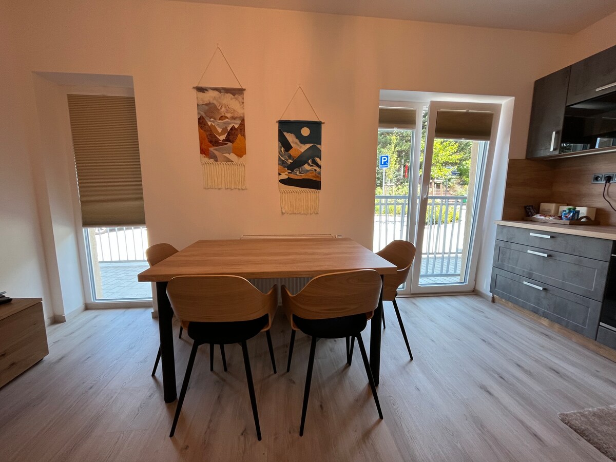 Tá an t - árasán suite sa ghairdín in aice le teach na n - úinéirí, lena n - áirítear bialann ina bhfuil cócaireacht den scoth. Tá an t - árasán feistithe go hiomlán lena n - áirítear cistin, leaba thoilg, leaba dhúbailte agus urlár codlata adhmaid ardaithe (1 leaba agus 1/2 leaba). I míonna níos fuaire agus sa gheimhreadh, téitear an réadmhaoin le sorn dóite adhmaid, atá ar fáil díreach in aice leis an réadmhaoin. Tá baile Unhošť suite 15km ó Phrág, is féidir leat línte díreacha bus nó traenach a úsáid ar iompar poiblí freisin. Tógann an turas 35 nóiméad.
