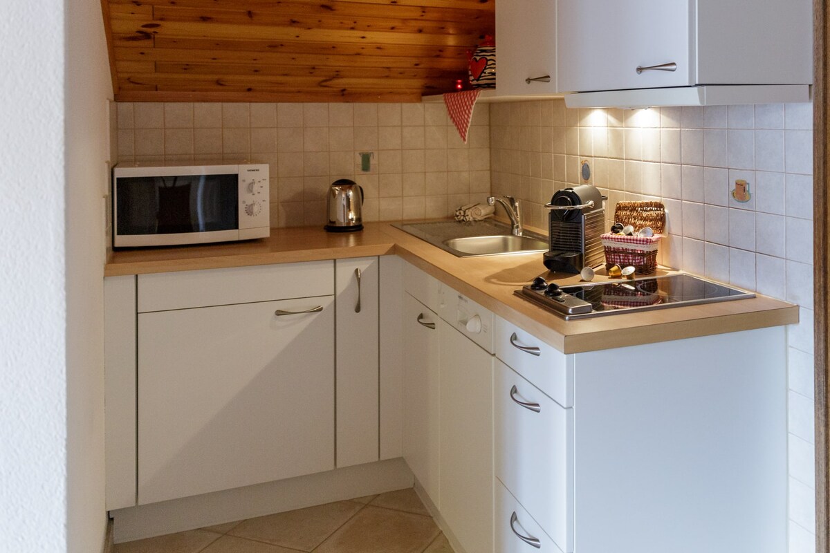 Ó sheomra leapa an tí saoire chompordach Spitzenstein seo, tá radharc iontach agat ar an sliabh a thug a ainm, “Spitzenstein” agus na beanna máguaird don teach. Tá an seomra mór ina bhfuil an cúinne suíocháin agus an áit chócaireachta feistithe go hiomlán. An seomra folctha nua - aimseartha ina bhfuil cithfholcadán agus leithreas agus balcóin álainn, thart ar an tairiscint.