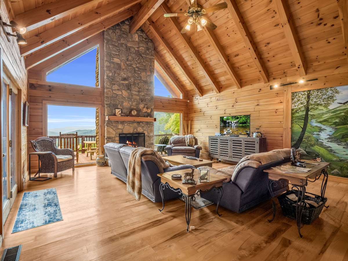 Saoire mhór sléibhe i bpobal Linville Falls in North Carolina. Cuirfidh ár gcábán cluthar campa bonn iontach ar fáil le haghaidh eachtraí spraíúla lasmuigh feadh an Blue Ridge Parkway, Grandfather Mountain, agus an Linville Gorge. Tar éis lá eachtraíochta is féidir leat a bheith ag tnúth le súmáil shuaimhneach sa tobán te le príobháideacht agus le huafás. Cuireann ár gcábán gach compord ó do theach féin in éineacht le háilleacht agus suaimhneas Shléibhte Blue Ridge ar fáil.