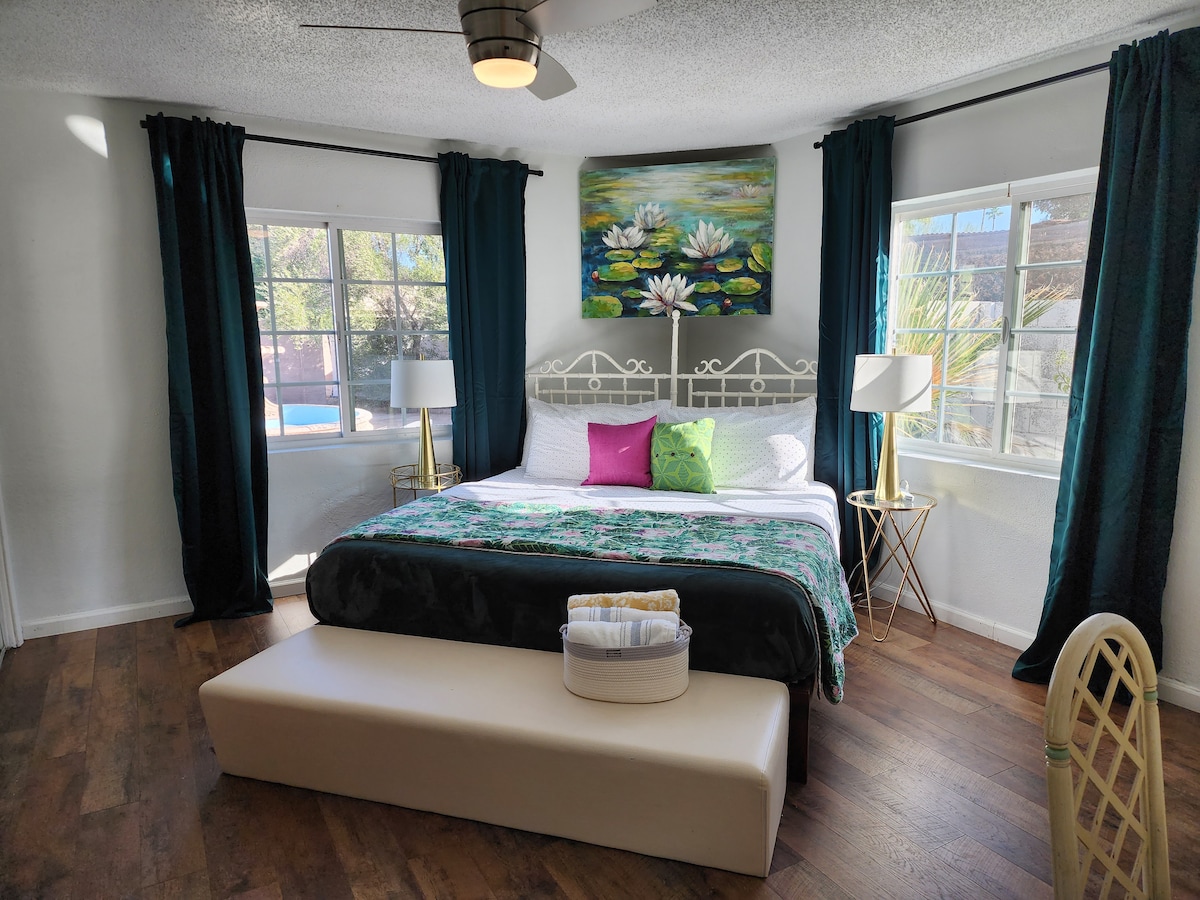 Ag siúl achar go dtí The Wigwam Resort! Tá bealach isteach príobháideach sa svuít phríobháideach seo chun rochtain éasca a fháil air mar is mian leat. Cithfholcadán siúil isteach tílithe, cistinéad, mionchuisneoir/reoiteoir, micreathonnán, déantóir caife Keurig, triomadóir gruaige, & mion - scoilt AC tiomnaithe. NÍL AON CHAITHEAMH TOBAC, NÍL AON VÁPÁIL, NÍL AON MARIJUANA, NÍL AON GHLÉASANNA LEICTREONACHA TOBAC. BEIDH VIOLATERS FAOI RÉIR TÁILLÍ GLANTACHÁIN BREISE A ÍOC SUAS GO $ 500.00. Ceadúnas Chathair Litchfield Park # 3065