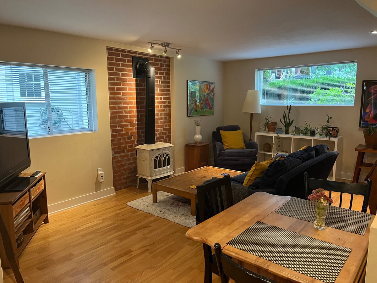 Tá compord nua - aimseartha agus draíocht theolaí ag fanacht leat sa teach aíochta lochta seo. Le teallach gáis fáilteach i stíl cábáin agus leaba rímhéide, is é seo an spás is fearr chun do scíth a ligean tar éis lá taiscéalaíochta! Tá cistin iomlán, paitió príobháideach agus seomra folctha nua - aimseartha le tobán sa teach féinchuimsithe seo. Neadaithe díreach as Céide Tráchtála bríomhar, tá tú ar shiúl ó na bialanna, na beáir agus na siopaí boutique is fearr in Vancouver. Agus níl Skytrain ach siúlóid 7 nóiméad ar shiúl. Sa chás go dtagann stíl nua - aimseartha le teas teolaí, táimid ag tnúth le tú a óstáil!