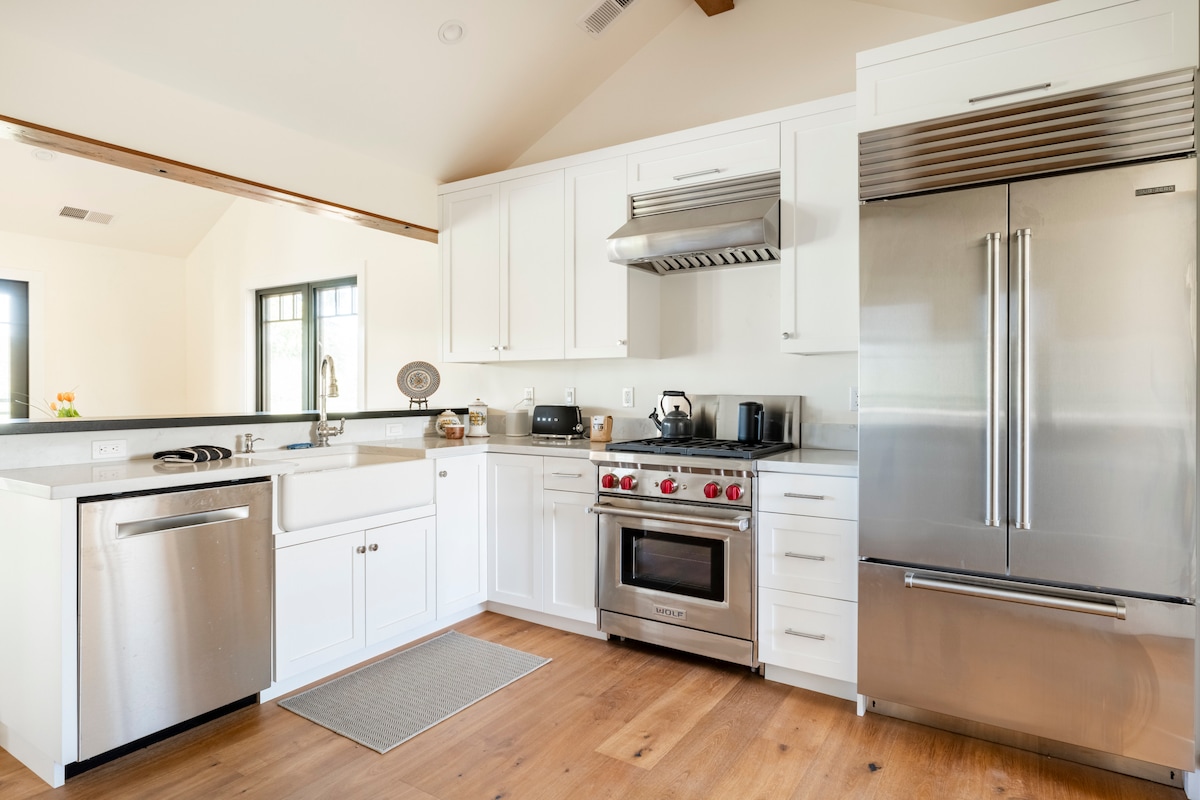 Tá an teachín trá éadrom agus aerach, an tsaoire rómánsúil fhoirfe. Radharcanna lánléargais intinne ar an Aigéan Ciúin le rochtain ar an trá ar ár gcuar príobháideach Wifi ar fáil síos ag An Pointe agus an trá/cove Pasfhocal mar an gcéanna leis an teachín. Ar fáil i leabhar na n - aíonna Soláthraímid seampú/feabhsaitheoir ardleibhéil, caife áitiúil rósta ó Little Green Bean, fíon súilíneach ó Mendocino County, uibheacha sicín úr saor in aisce, olaí cócaireachta orgánacha agus na spíosraí riachtanacha ar fad.