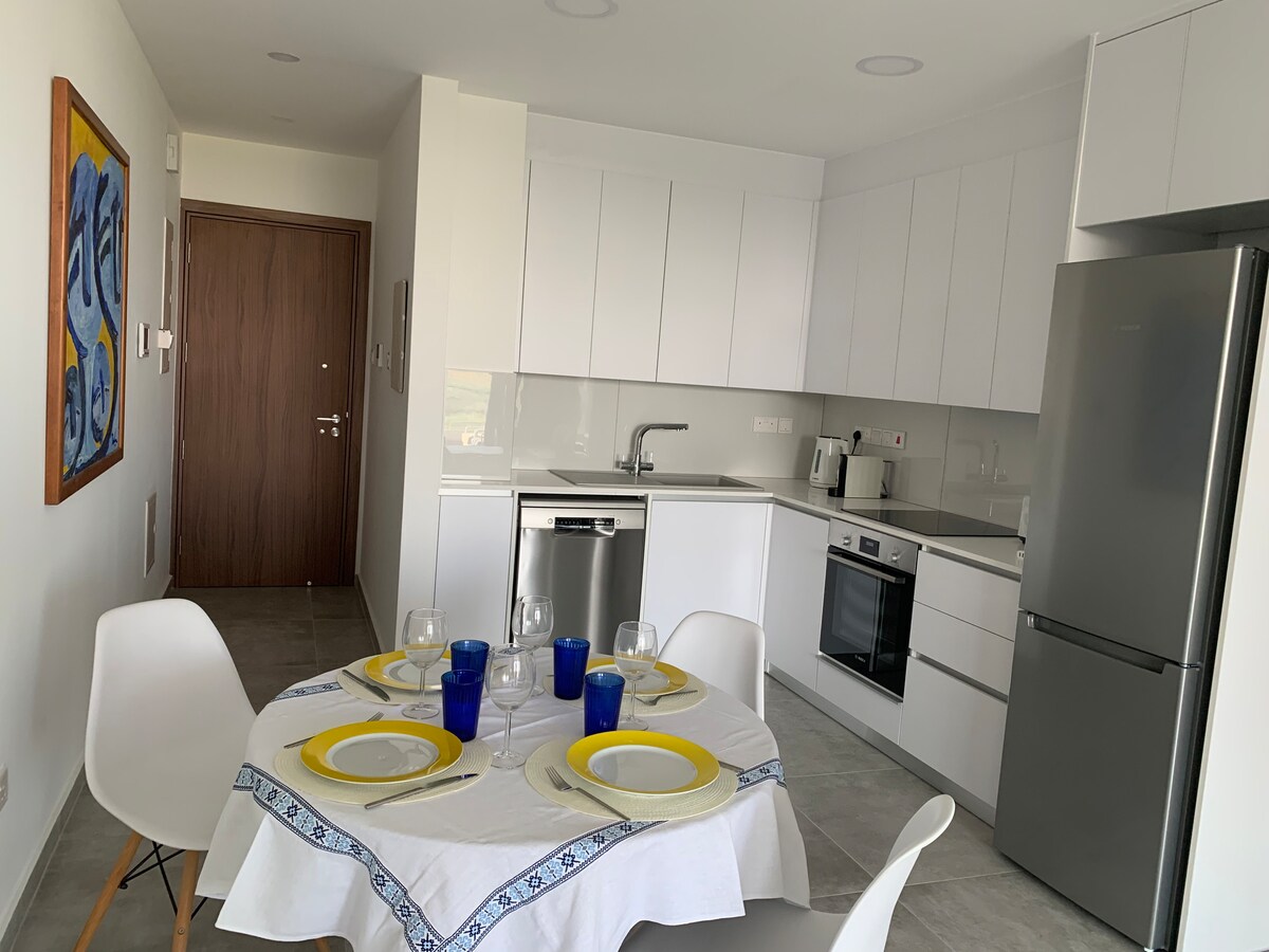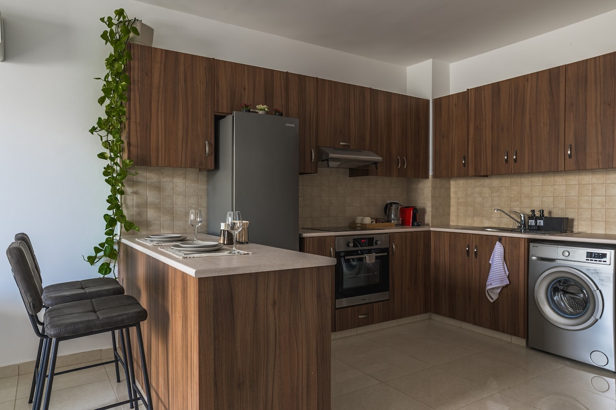 Fáilte go dtí ár nÁrasán Chic & Nua - Aimseartha 1 Seomra Leapa! Tairgeann an t - árasán úrnua seo atá deartha go blasta teach teolaí galánta as baile i gcomharsanacht chiúin, díreach nóiméad sa charr ó lár Larnaca agus laistigh d'achar siúil go dtí an trá. Bain sult as compord áit mhaireachtála ghalánta agus lig do scíth ar an mbalcóin phríobháideach le radhairc áille ar an bhfarraige - foirfe do chaife maidine nó do thráthnóna suaimhneach. Foirfe do shaoirí gearra agus do thréimhsí fanachta fada araon.