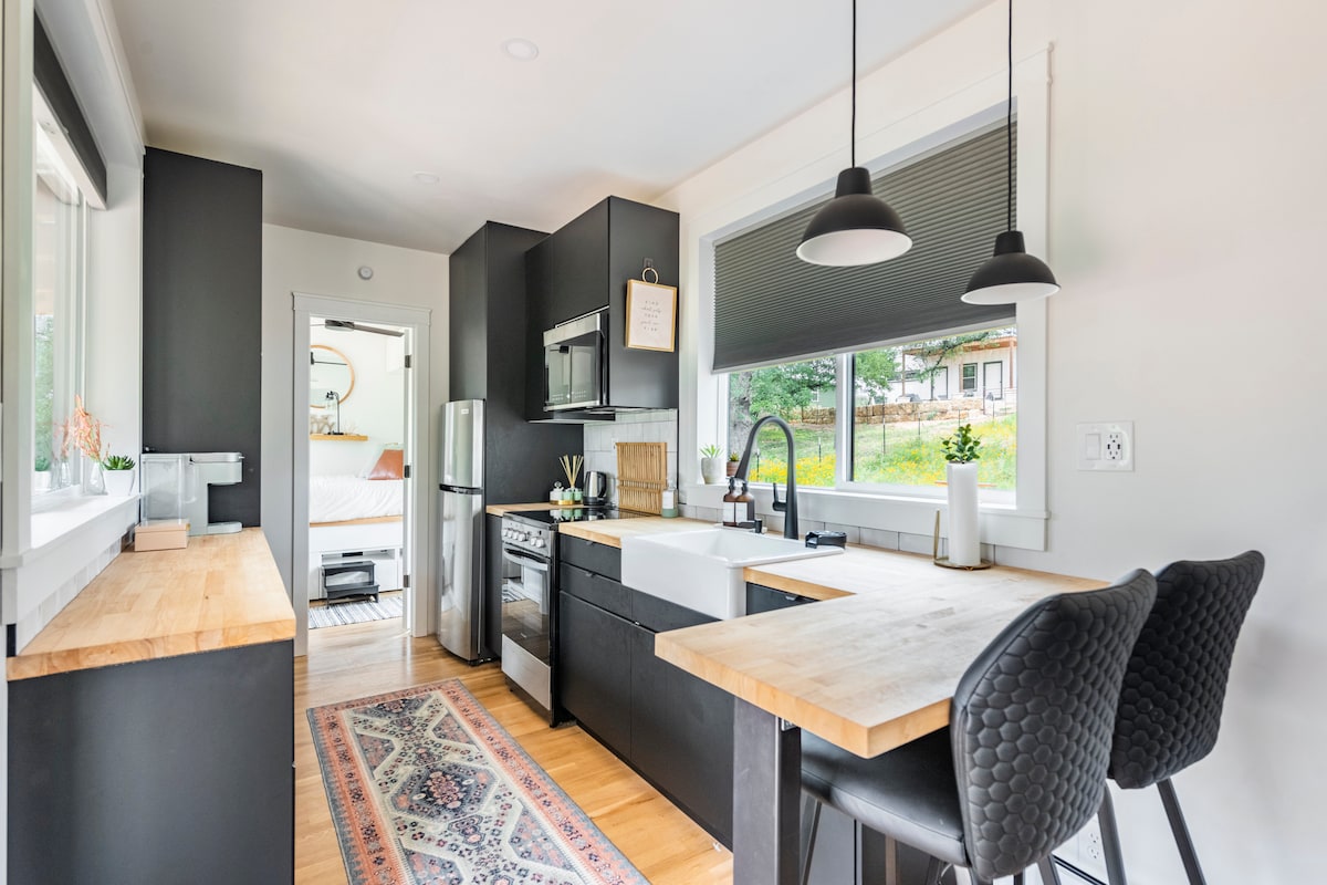 Téigh isteach i gceann de na cábáin bheaga is giorra, is coziest, is baile a d'fhéadfá a fháil! Ón am a shiúlann tú tríd an doras, déanfar tú a chlúdach sa bhaile. D'fhéadfadh an spás a bheith beag, ach d'fhéadfadh fuinneoga ar gach balla, an tsíleáil buaicphointe, agus an scéim shuaimhneach dhaite agus dath liath a spreagadh le mothú na hoscailteachta! Suite go foirfe i lár Thír Chnoc Texas, beidh tú réidh le haghaidh eachtra ar bith nuair a aimseoidh tú an cábán a bheidh ar an láthair is binne i do thaisteal!