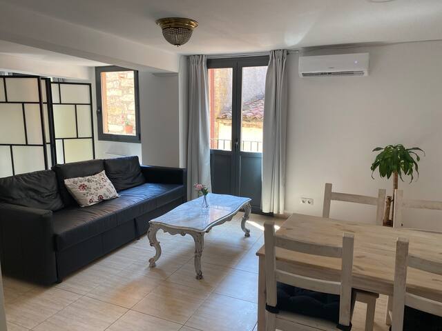 Private studio with fully equipped kitchen, sofa (with double folding bed), TV and bathroom. It also has a balcony overlooking the countryside with an outdoor table and chairs. During the summer, you will have free access to the municipal swimming pool. The accommodation has heating or air conditioning that can be adjusted to your liking, free Wi-Fi internet. The price includes bed linen and towels.