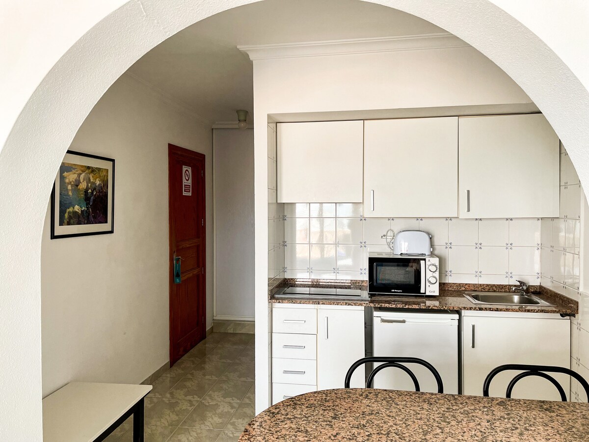 Lonnaithe in Portocolom, tá gach rud a theastaíonn uait le haghaidh saoire shuaimhneach san árasán in óstán Seomra Radharc na Mara 202 le rochtain gan chéimeanna agus taobh istigh. Is éard atá sa réadmhaoin 45 m² seomra suí le leaba thoilg do bheirt, cistin, seomra leapa amháin agus seomra folctha amháin agus dá bhrí sin is féidir le 4 dhuine freastal air. I measc na saoráidí breise tá Wi - Fi ardluais (atá oiriúnach d'fhísghlaonna), teilifíseán, aerchóiriú chomh maith le tuáillí trá/linn snámha. Tá cóta linbh ar fáil freisin.