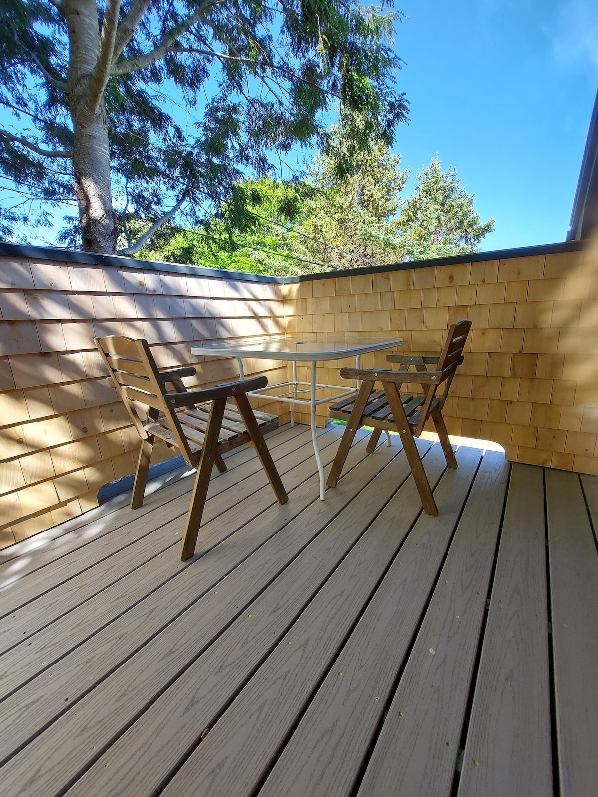Suíonn Hummingbird thart ar 50 troigh ónár dteach agus thart ar 150 troigh ó chladach Joy Bay. Ag féachaint amach ar na fuinneoga, ní fheiceann tú ach coillte agus uisce. Níl aon chomharsana sa radharc. Tá madra againn a fheiceann go bhfuil sé de dhualgas uirthi beannú díograiseach a thabhairt do gach duine. Tá an foirgneamh 12x16 agus tá seomra folctha agus cistinéad beag ann. Maidir le cócaireacht, tá barr cócaireachta ionduchtaithe, oigheann tóstaer, agus potaí agus pannaí ann. Tá an paitió 10’ faoi 16’ agus tá tábla ann ina bhfuil 2 chathaoir, gríoscán gáis, agus barr cócaireachta lasmuigh.