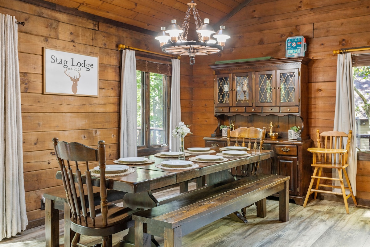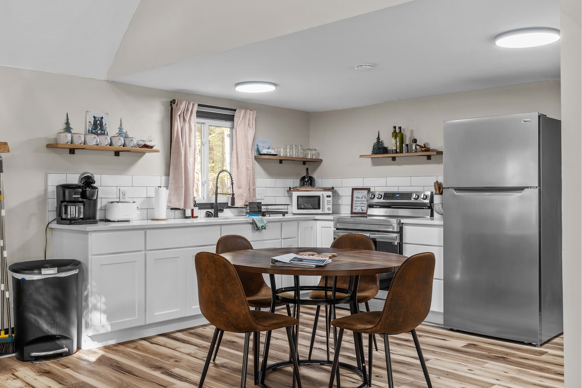 Meascann PBJ Chalet stíl nua-aimseartha le compord clasaiceach sléibhe sa teach fairsing seo in Pocono. Lig do scíth sa tobán jacuzzi, cruinnigh le chéile timpeall dhá thinteán, nó bain sult as oícheanta cluichí le tábla púil, árcáid agus cuisneoir fíona. Cuireann leapacha rí, Wi-Fi tapa agus luchtaire Tesla le háisiúlacht, agus cruthaíonn timpeallacht shíochánta na coille an timpeallacht fhoirfe do thurais teaghlaigh agus do shaoirí grúpa. Cuir clabhsúr leis an tráthnóna timpeall ar an bpoll tine faoi shreangán soilse agus bain sult as fanacht suaimhneach sna Pocono Mountains.