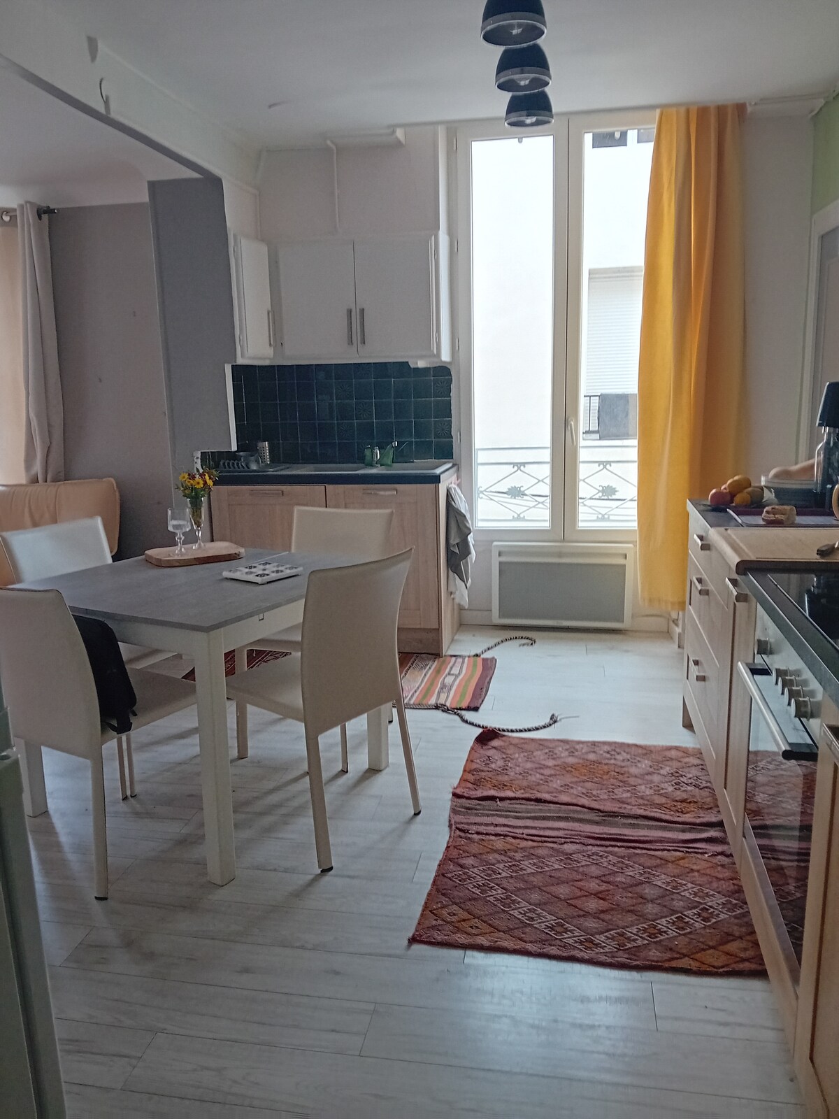 Is teach sráidbhaile 50m2 athchóirithe go hiomlán é seo. Is féidir leat taitneamh a bhaint as draíocht an tsean-áit agus gach compord a theastaíonn uait. Tá an teach suite ar an mbunurlár agus radharc ar chearnóg an tsráidbhaile ar thaobh amháin agus ar an ngairdín ar an taobh eile. Tá sé ciúin agus suaimhneach, tá seomra suí mór, seomra bia, cistin agat. I ndiaidh a chéile gheobhaidh tú seomra leapa fairsing ina bhfuil a sheomra folctha agus a leithreas ag breathnú amach ar spás glas. Stáisiún luchtaithe ar fáil - Táille bhreise. Níl A/C ann