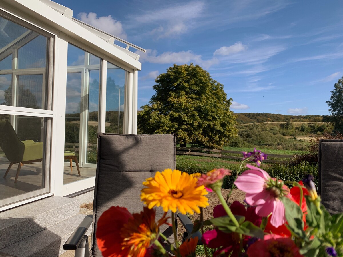 Tá an teachín suite i seanteach feirme athchóirithe timpeallaithe ag páirceanna agus cosáin iontacha a osclaíonn arís agus arís eile an radharc ar an Muir Bhailt agus ar an Bodden, cúpla nóiméad tiomáint ó thránna breá gainimh an Schabe.