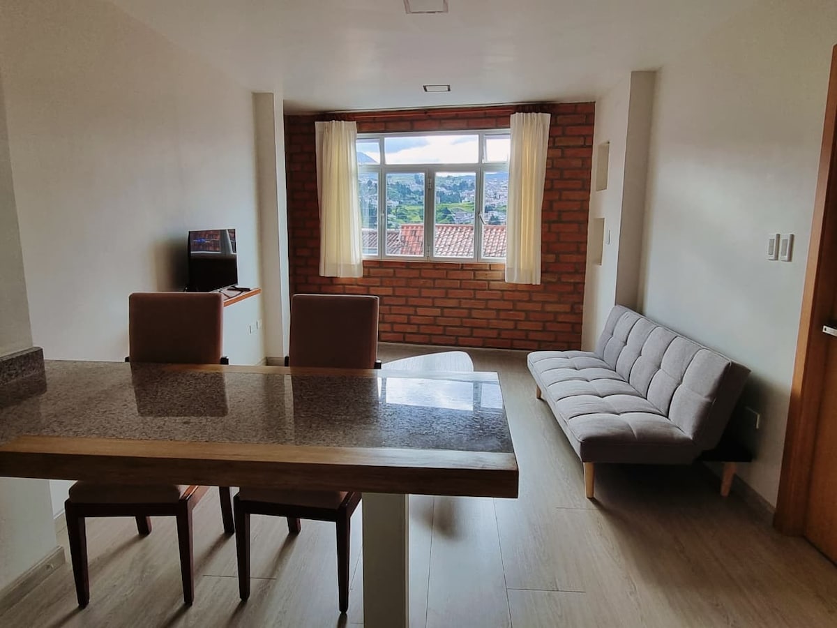 Roinn Só i gceantar eisiach de chathair Loja, árasán atá feistithe go hiomlán le páirceáil phríobháideach SAOR IN AISCE. Uirbiú sómasach,Segura, ciúin, beidh tú cúpla nóiméad ar shiúl ó lár na cathrach, ionad siopadóireachta, Multiplazas, UTPL, UNL agus Parque mirador Pucará. Tá 2 sheomra leapa, 2 sheomra folctha, jacuzzi, 2 theilifís, áit ghlas, seomra suí, cistin, seomra bia, radharc iontach ann agus beidh an príobháideacht agus an compord atá tuillte agat.