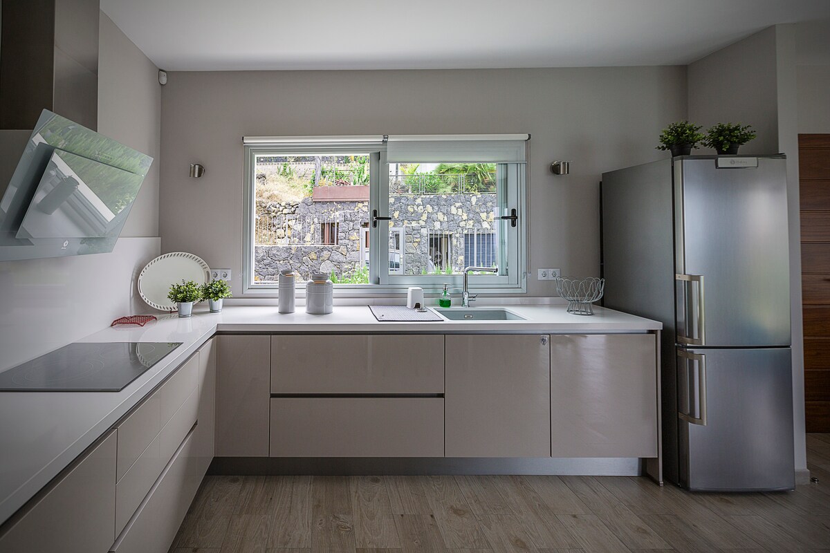 Villa 3 sheomra leaba le linn snámha phríobháideach, limistéar fairsing suí, agus radhairc iontacha ó gach fuinneog. Príobháideacht iomlán — níl an villa le feiceáil ag comharsana, mar sin is féidir leat do scíth a ligean i ndáiríre. Tost iomlán, gan aon torann cathrach nó mhórbhealaigh, ach níl phromanáid Puerto de la Cruz ach 10 nóiméad ar shiúl. Téitear an linn snámha ó cheann ceann na bliana le painéil ghréine. Dóibh siúd ar fearr leo teas breise, tá teas breise roghnach suas le 26°C ar fáil ar €200 in aghaidh na seachtaine. Netflix, Wi-Fi tapa, agus cathaoir shuathaireachta den scoth.
